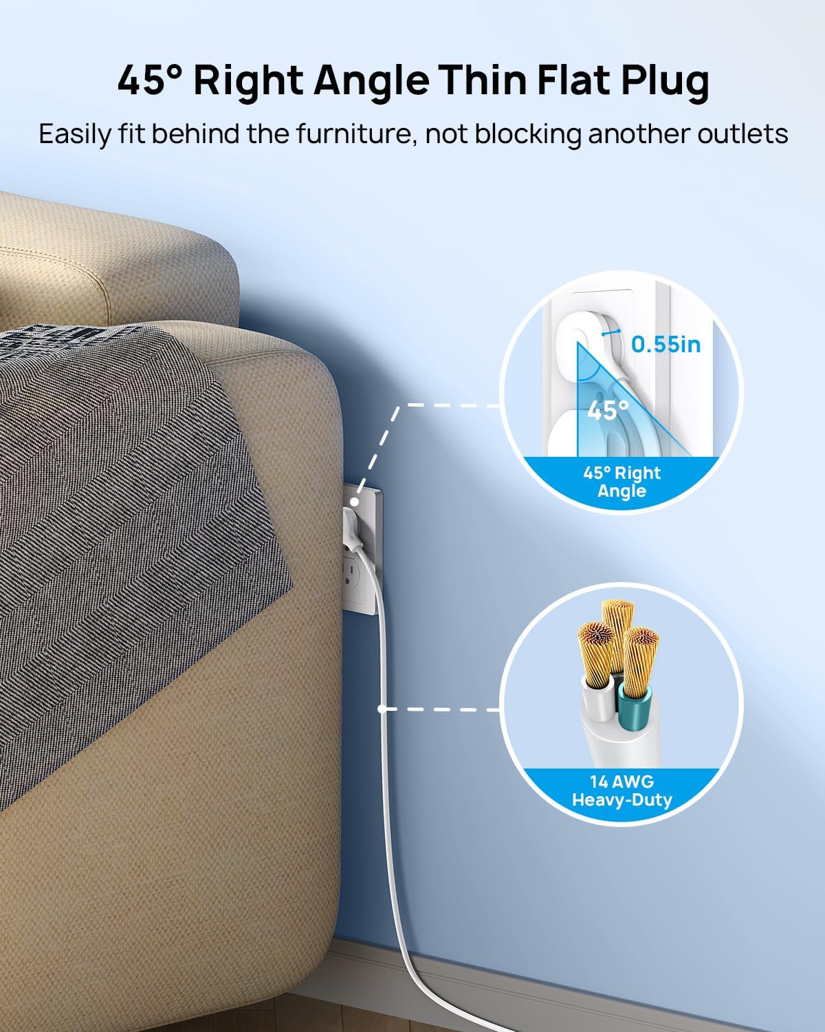 • 【Flat Plug Power Strip】Our heavy-duty power strip with a 0.55in low profile flat plug easily fits behind furniture close to the wall, and the 45° angle flat plug won't block the bottom outlet, so you can make full use of wall plugs in your home. The 5ft extension cord is made of 14AWG pure copper wire, providing more current carrying capacity (15A)