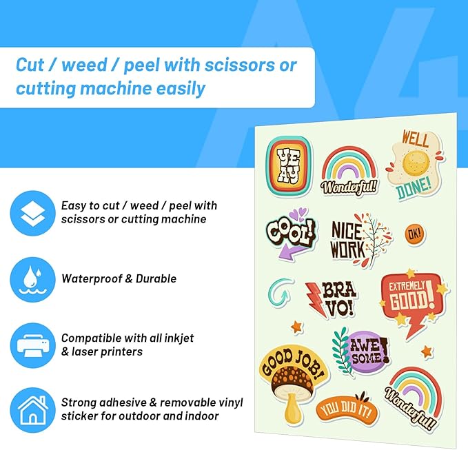 • Easy to Use with Printers & Cutters - This Inkjet printable vinyl sticker paper in a standard size of 8.26" x 11.69" can be used for inkjet printer. It’s also compatible with all craft cutters and easy to cut with a scissors.