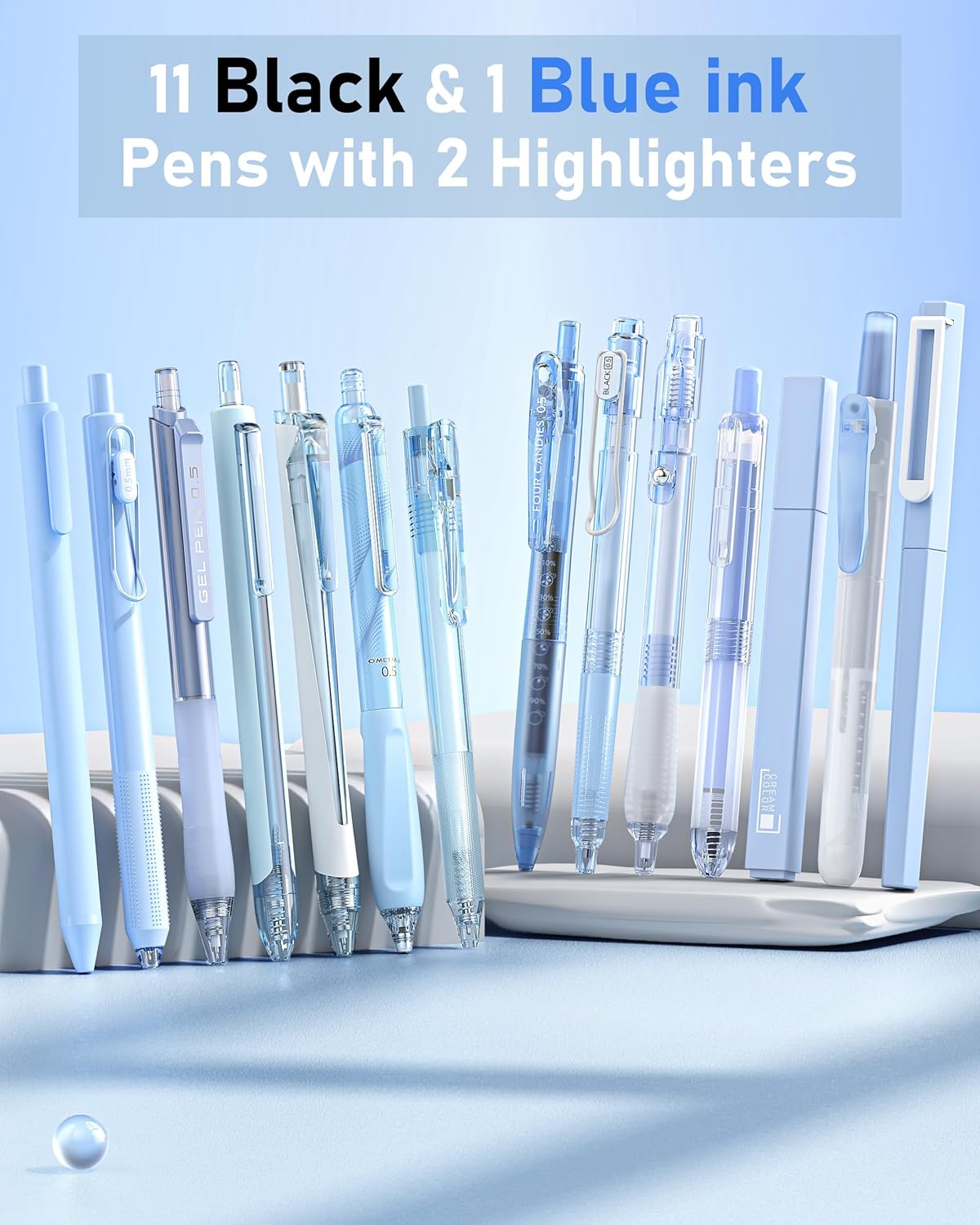 Four Candies 14Pack Pastel Gel Ink Pen Set,Cute Retractable 0.5mm Fine Point Pen,Note Taking Aesthetic Pens,12 Pack Black Ink Pens with 2Pack Highlighter, Smooth Writing Pens for School, Office (Blue)