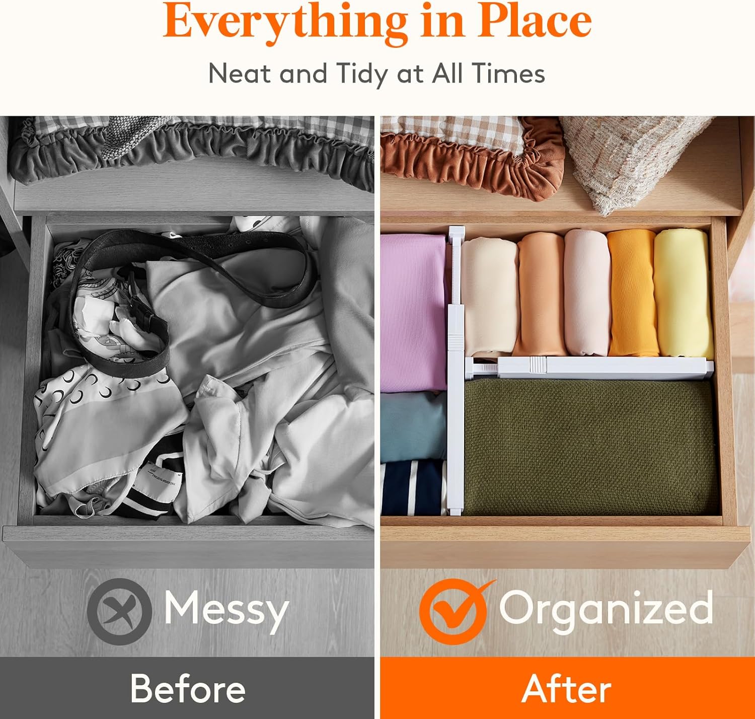 • Easy Installation & Removal: Press the top button to adjust the length before placing, and stretch it out again to secure it tightly before locking it. The strong spring tension keeps each drawer organizer securely upright. To retract, press the top button and push the stretched side.