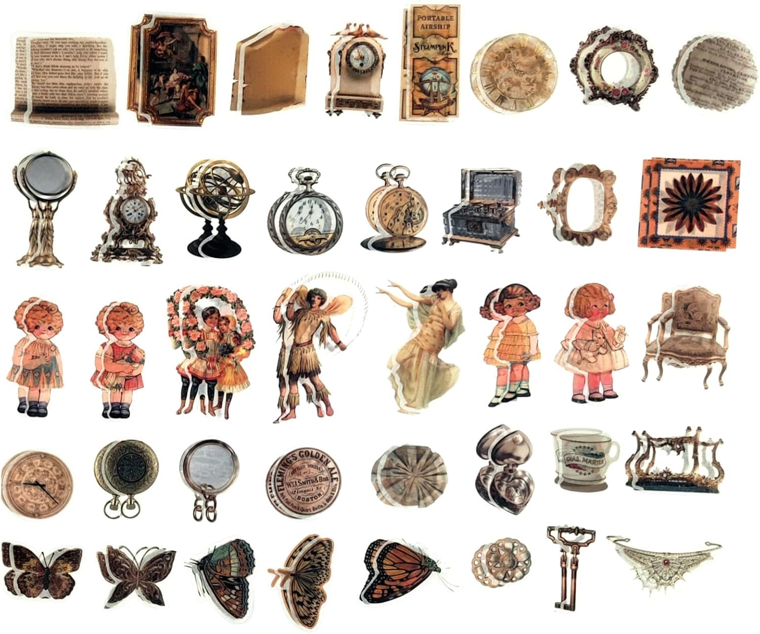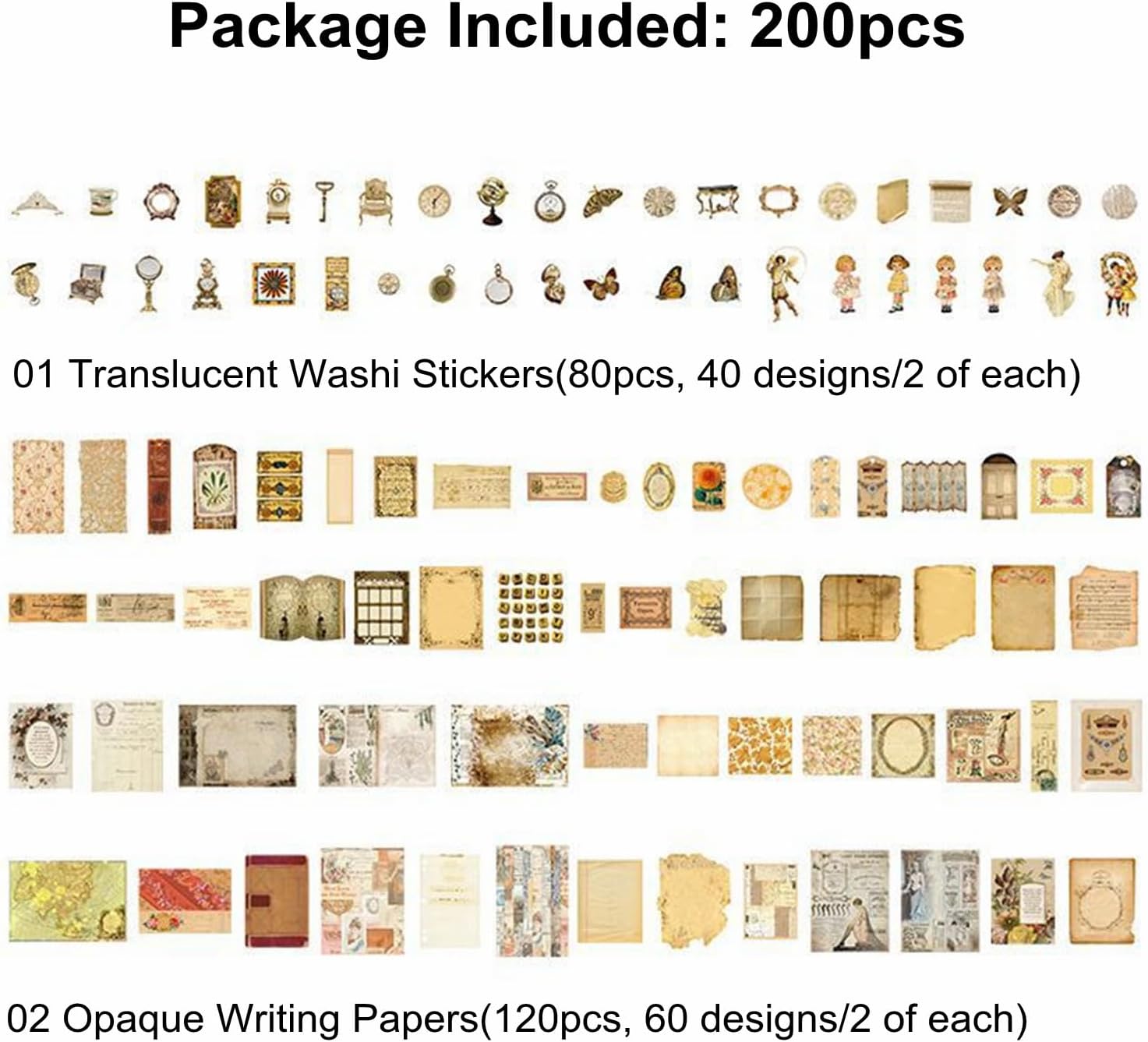 • Design: 80pcs washi stickers with 40 designs, 2 pieces of each; 120pcs vintage printing papers with 60 designs , 2 pieces of each.