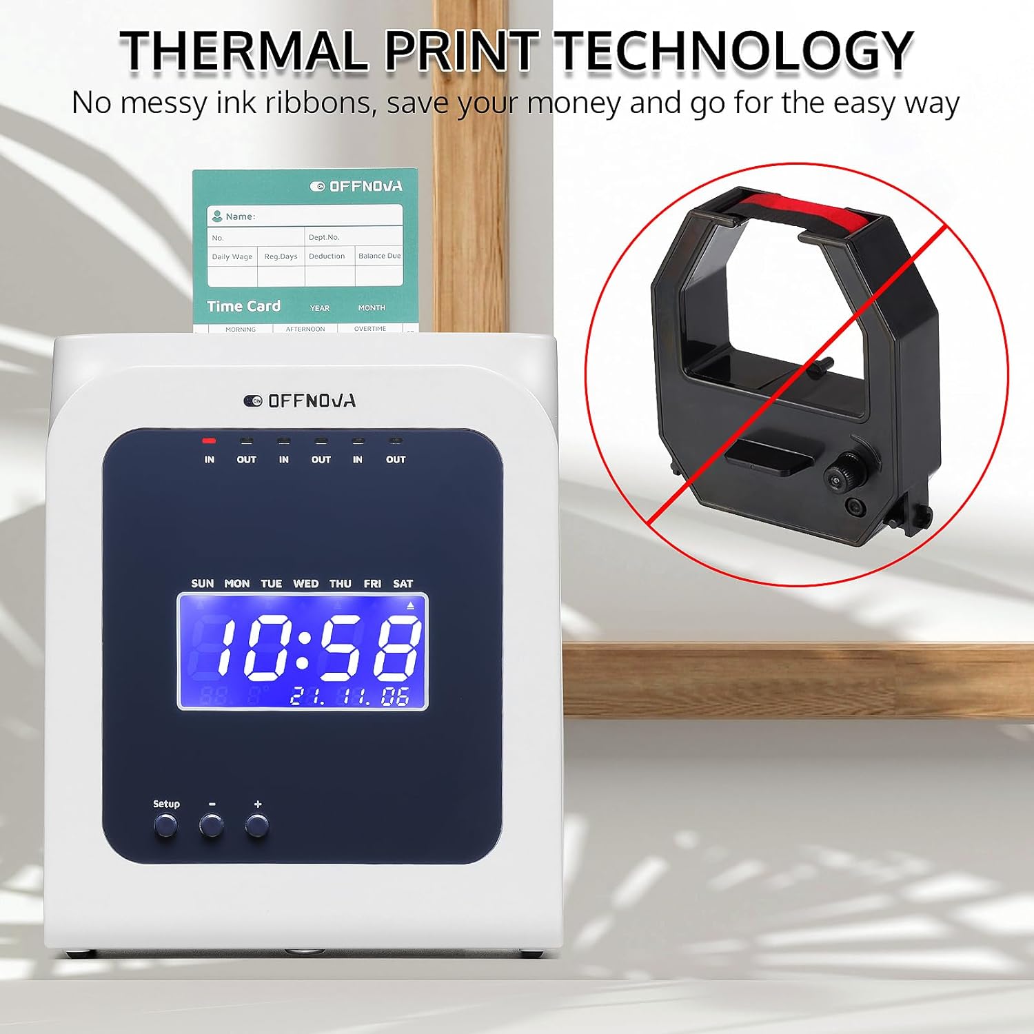 OFFNOVA Thermal Time Clock for Employees Small Business, No Ink Ribbons or Network Needed, in/Out Time Attendance Machine with 50 Time Cards