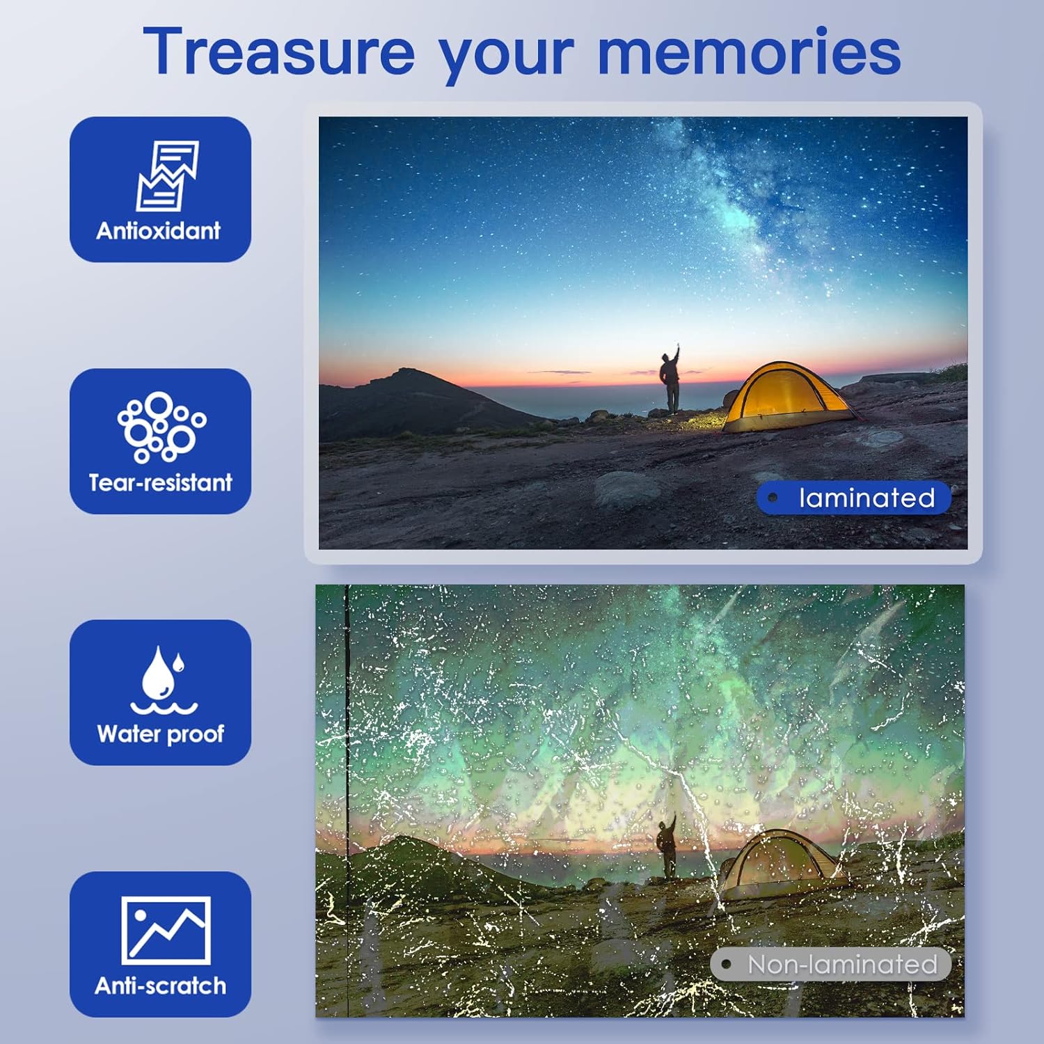 • Widely Compatible: They come in a variety of sizes so you can find the perfect pouch for any job. Our laminating sheets are perfect for preserving documents, photos and other mementos. 3Mil (80mic) thickness, laminated photos are more secure.