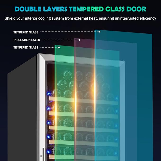 • 【Double-Layer Glass Door and Safety Lock Design】The wine cabinet features a double-layer tempered glass door, presenting a visually appealing wine display. This design effectively insulates against external temperature fluctuations, ensuring wines remain in optimal storage conditions. The safety lock adds an extra layer of security for your valuable collection.