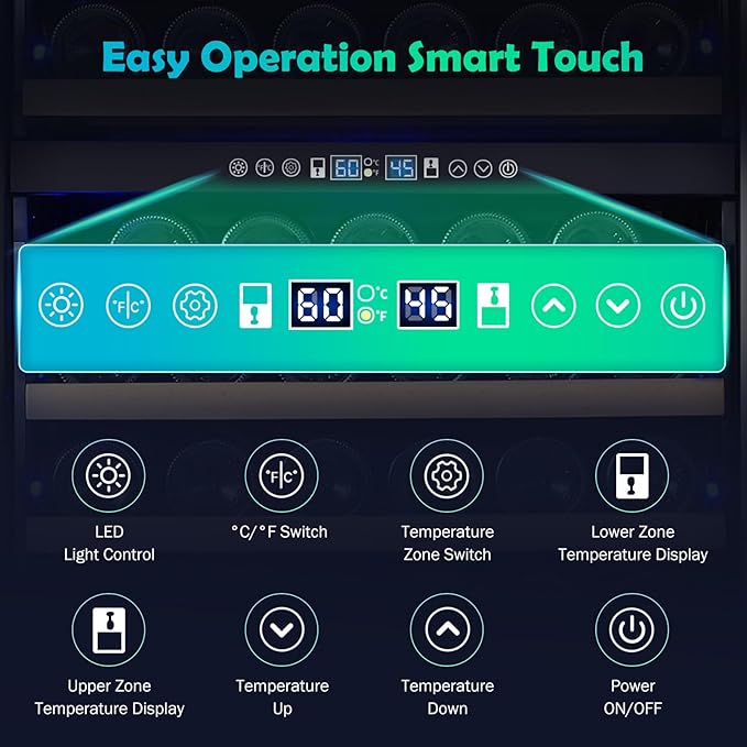 • 【Advanced Compressor Cooling and Circulation System】The ORYMUSE large dual-zone wine refrigerator employs cutting-edge compressor technology and a robust circulating fan, delivering rapid, powerful, and stable cooling. The internal upper and lower zone air circulation system ensures even distribution, allowing you to store different wines according to specific temperature range needs. Adjustable temperature range for the upper zone: 40-55°F (5-13°C), lower zone: 55-65°F (13-18°C).