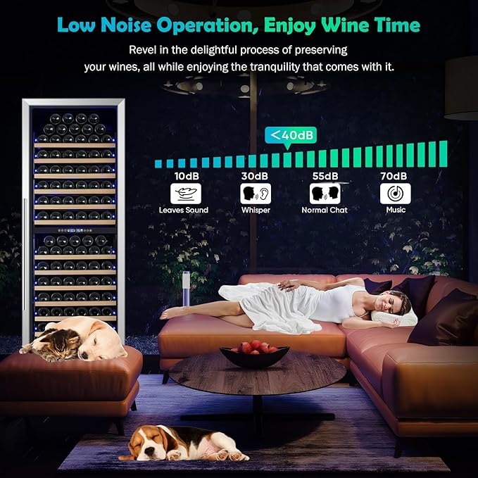 • 【Beechwood Shelf Design】The ORYMUSE wine fridge features 15 beechwood shelves, accommodating up to 200 standard Bordeaux (750 ml, thickness ≤ 2.75'') Wine bottles. With a spacious bottom design, it accommodates various wine types. Beechwood ensures strong stability, humidity control, and durability, and is environmentally friendly and healthy.