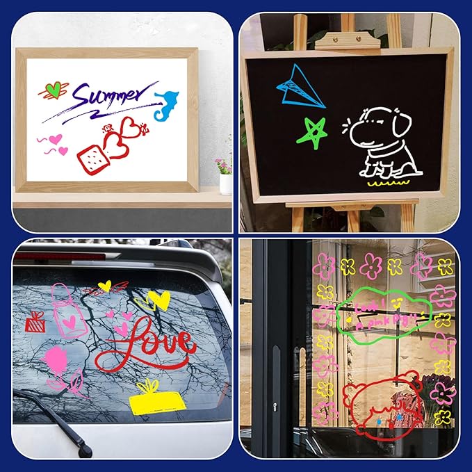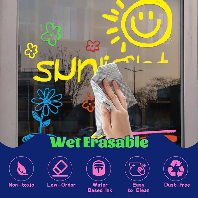 • 【Effortless Cleanup】Bid farewell to mess with these completely dust-free window paint markers. They function as wet erase markers, easily wiped off most non-porous surfaces using a damp cloth. Remember to cap the Wet erasable glass pen window marker after each use to prevent drying out.