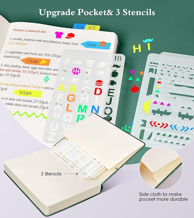 • 【Humanized Design】 ❶ 360 numbered pages, 6 contents pages, you can easily keep organize of all your ideas and notes.❷2 3 stencils for journaling (5.4''*8.07'') help you to make page layout and artistic creation better and faster. 2 Bookmarks to help you find important content faster..❸ Back Inner pocket can holds notes, business cards, small gadgets, etc. ❹ Closes with an elastic band, Pen holder loop for any pen.