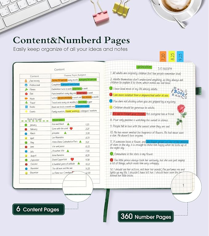 • 【Humanized Design】 ❶ 360 numbered pages, 6 contents pages, you can easily keep organize of all your ideas and notes.❷2 Divider sticky notes, 2 Bookmarks to help you find important content faster..❸ Back Inner pocket can holds notes, business cards, small gadgets, etc. ❹ Closes with an elastic band, Pen holder loop for any pen.