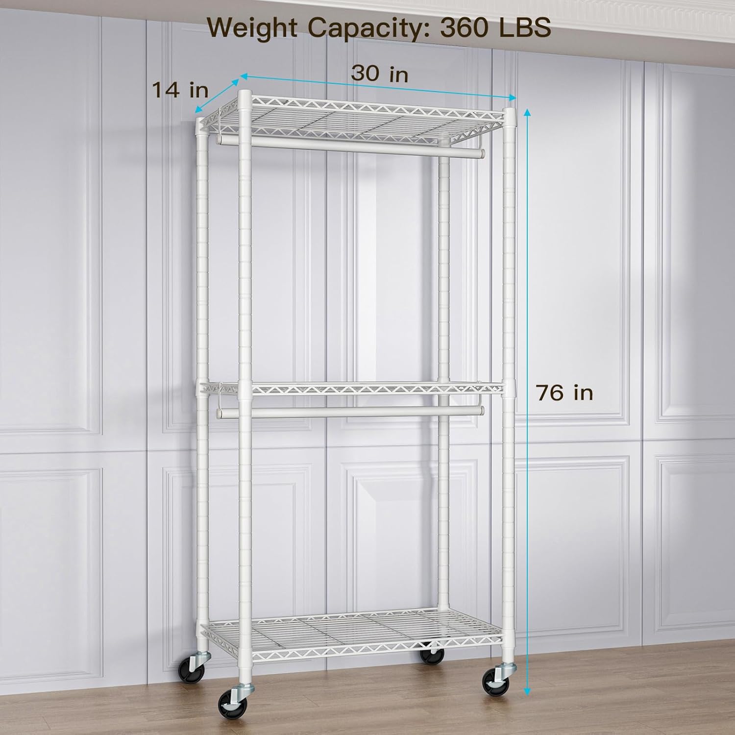 • [Overall Size & Load Weight]: The overall dimension is 30"W x 14"D x 76"H, and it can load 360 pounds with 3 adjustable wire shelves and 2 sturdy clothes hanging rods