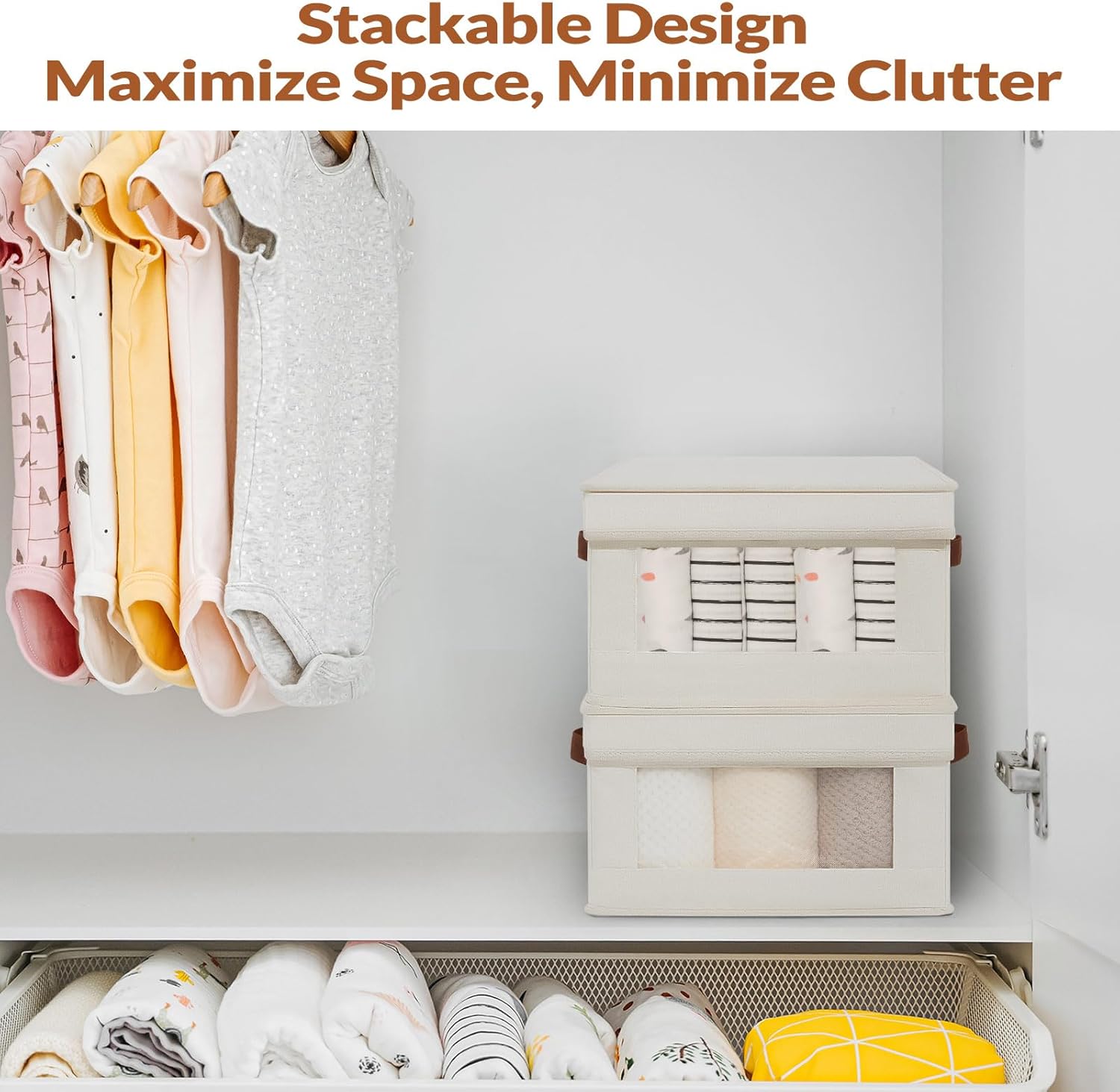 Fabric Storage Bins with Lids, Collapsible Closet Organizer with Sturdy Handles, Clear View Window, Stackable Storage Baskets for Clothes, Towels, Books, Hand Pull Closet Organizer Boxes-2-Pack, Beige