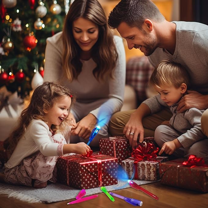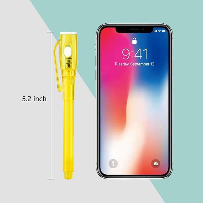• Spy Pen: The ink is invisible after you write with it unless you light on the cap blacklight to see the secret message perfectly. The reusable magic pen with built-in lights has 7 different colors, but the ink is the same color.