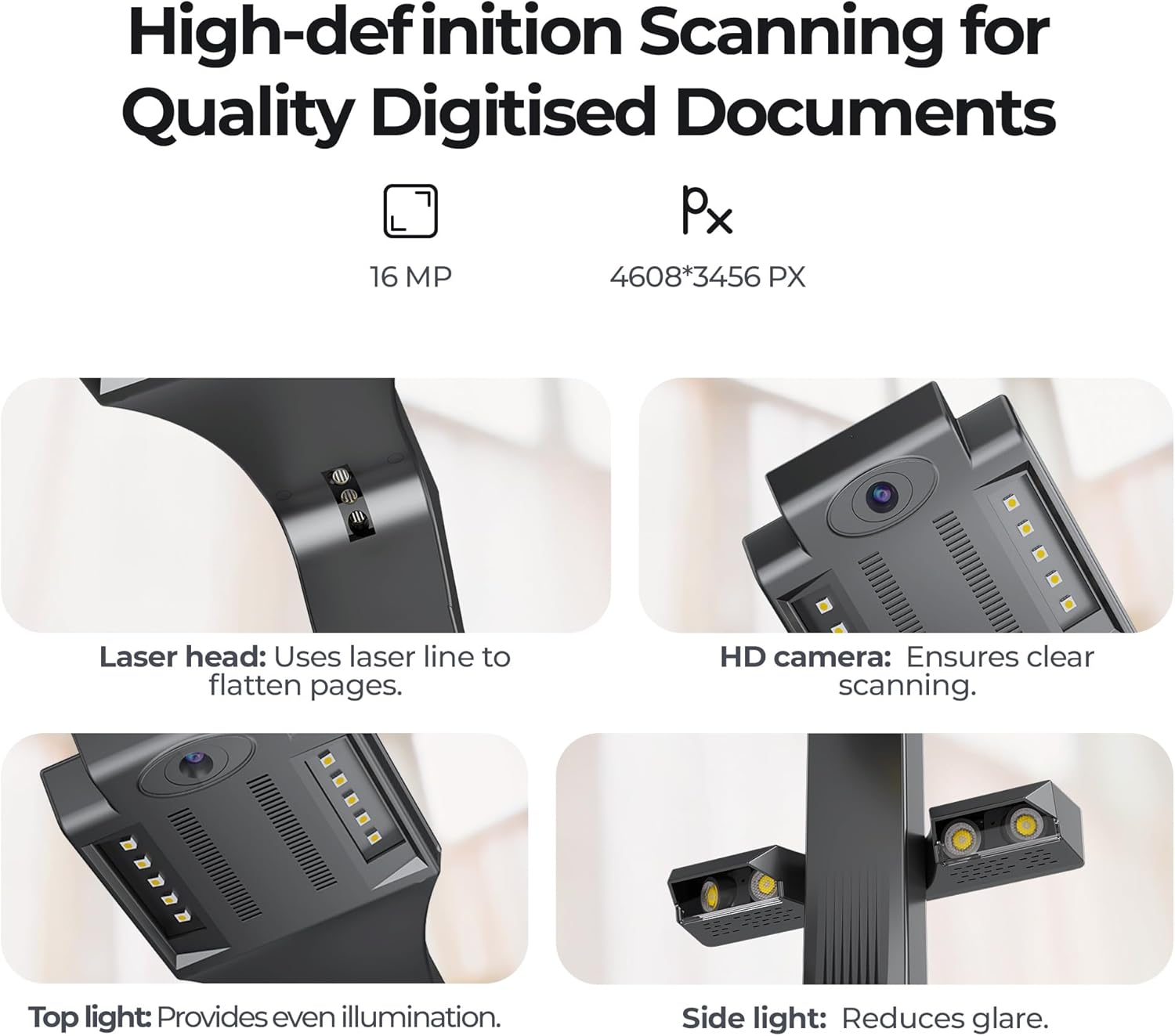 • 10 LED Lights +2 Supplemental Lights: sufficient light exposure, making scanning document shadowless, for best scanning results