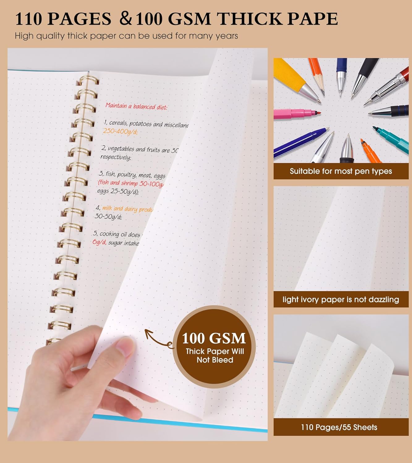 • 【100 GSM Ink-friendly Paper】 Our blue spiral dot grid notebook pages are very thick, which avoids ink bleeding through and ghosting. Suitable for most pen types, such as ballpoint pens, fountain pens. Each dotted journal 55 sheets/110 pages, offering enough space to write in. Allowing you to write on both sides of every page to maximize your usable space. light ivory paper is not dazzling, let you have a comfortable writing experience.