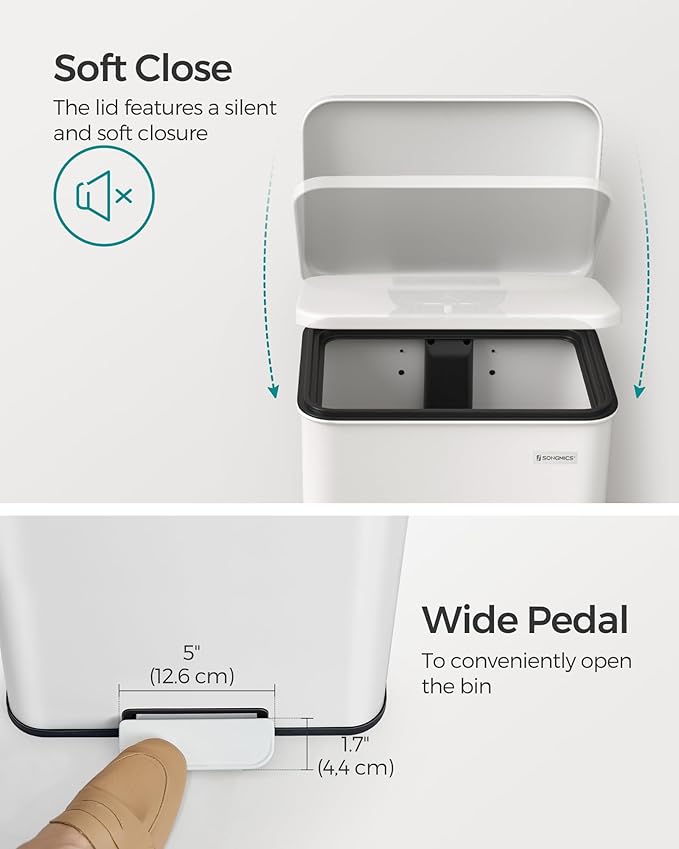 • [Soft Closure] The trash can features a slow, silent, and soft-close lid. No more dealing with loud clangs after use—enjoy a quieter and smoother disposal experience
