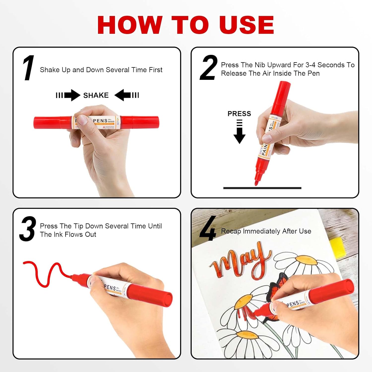 • 【Pay Attention】 For the first time,there are only three simple steps to use this pen.First,shake the pen fully,with the nib pointing upwards to expel the air inside the barrel,then press the nib downwards to fill the nib with ink,then it can be used normally. After each use,please remember to put the cap on to prevent the product from drying out!Each paint marker pen is packed in a separate heat shrink film to avoid leakage during shipping and storage.