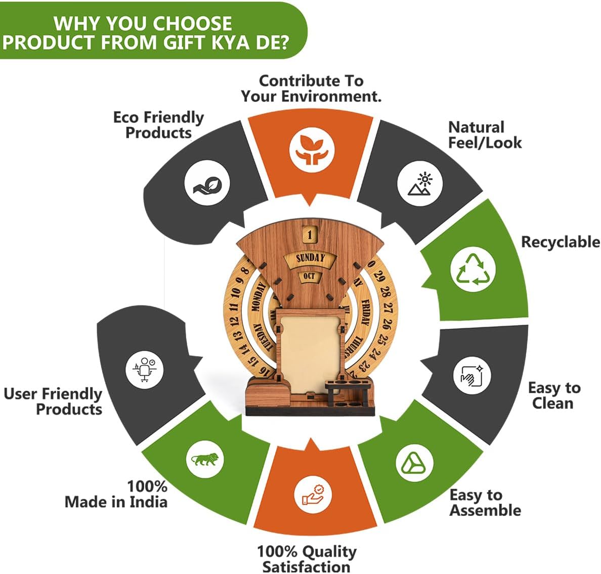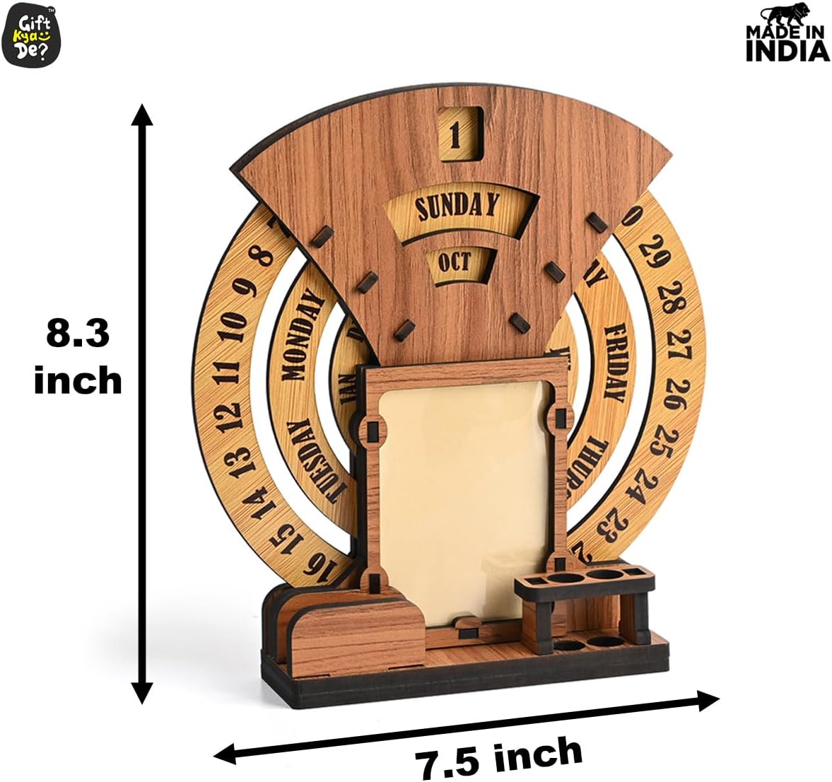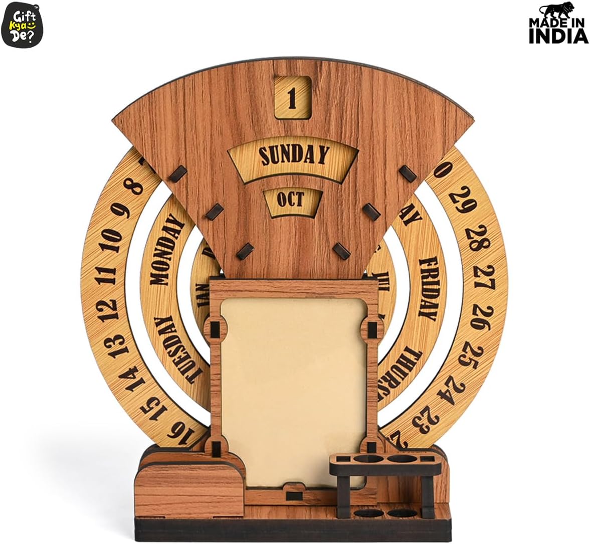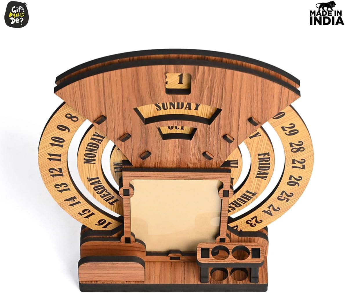 • Designer Home Decor: The beautiful designer calendar 2025 , where you can keep your photo, pen, and cardholder that serve as the perfect piece of home and office decor. Three individual circular rings dedicated to dates, days, and months are placed in an indigenous manner, which may be rotated very easily and precisely to change days, dates, and months to give you a new day every day. This calendar for desks is not limited to any particular year.