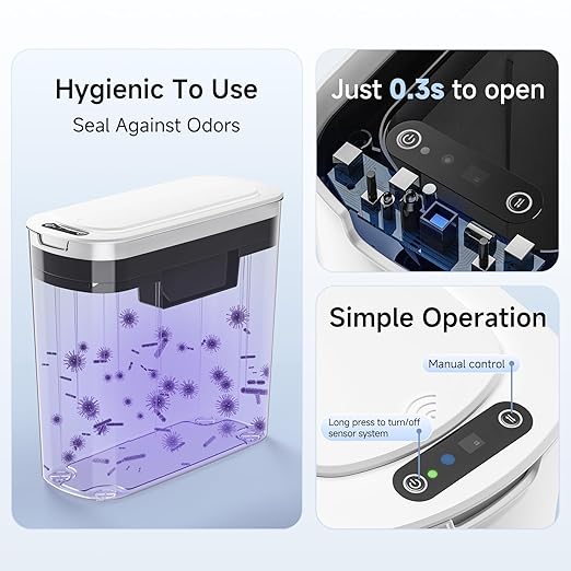 • 【Touchless Trash Can】Adopts advanced infrared technology. The lid opens when your hand or any object is detected in the sensing area, eliminating the need for direct contact, particularly beneficial for individuals with mobility challenges. Requires 2 AA batteries (not included)