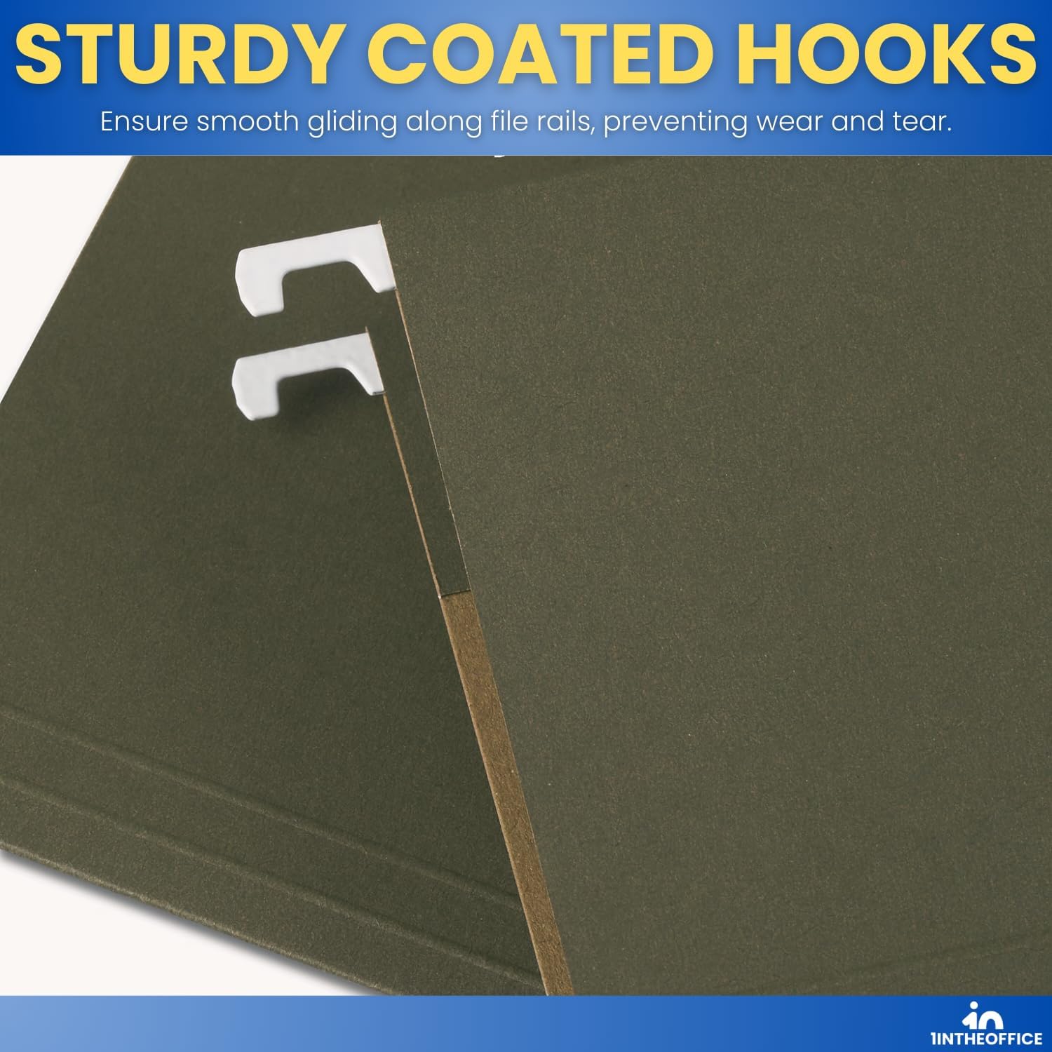 • Hanging folders have built-in hanging hooks for use in filing cabinets and are made of high-quality, 11 pt. stock that resists tearing.