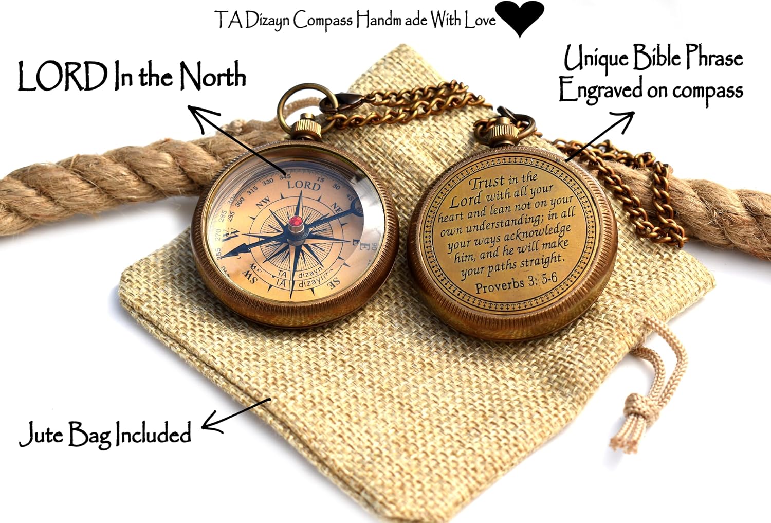 • Solid Brass Compass Antiquated Brass Finish With Trust in The Lord with All Your Heart -Proverbs 3: 5-6 Quote Engraved Compass with Jute Bag.