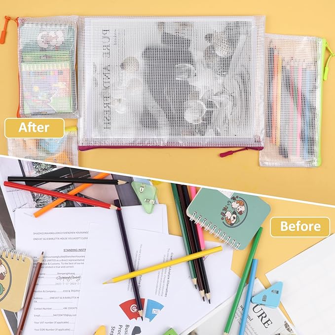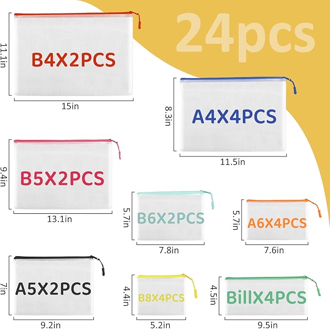 • PACKAGE CONTAINS:24pcs bag organizer: 2xB4 (15.6 x 11.2 inches), 4xA4 (13.6 x 9.6 inches), 2xB5 (11.6 x 8.4 inches), 2xA5 (9.4 x 6.8 inches), 2xB6 (7.8 x 5.6 inches), 4xA6 (7 x 4.8 inches), 4xBills (9.4 x 4.2 inches), 4xB8 (5.4 x 3.8 inches). Storage bags can be used to store teaching supplies such as pencils, books, rules, include handwork collection