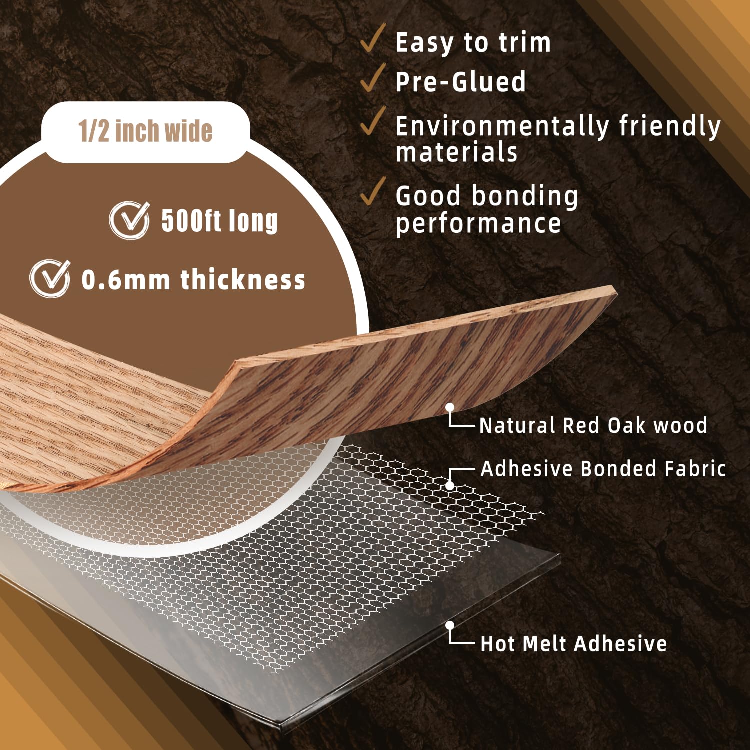 GSCIT Club Red Oak Edge Banding, 1/2 inch x 500ft roll of Wood Veneer Edge Banding Pre-glued Flexible, Real Wood Tape Banding for Cabinet Repair Furniture Restoration