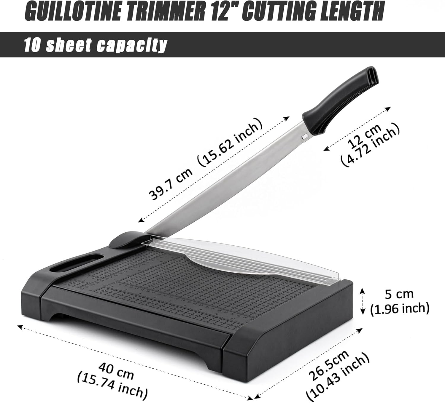 • Cutting Capacity 5 to 10 Sheet : The guillotine paper cutter easily cutting paper 5 sheets one time; After texting 10 sheets or more will take more effector for cutting and cause raw edge inch and centimeter markings for seamless cutting;Not suitable for cutting fabric leather and metal plates
