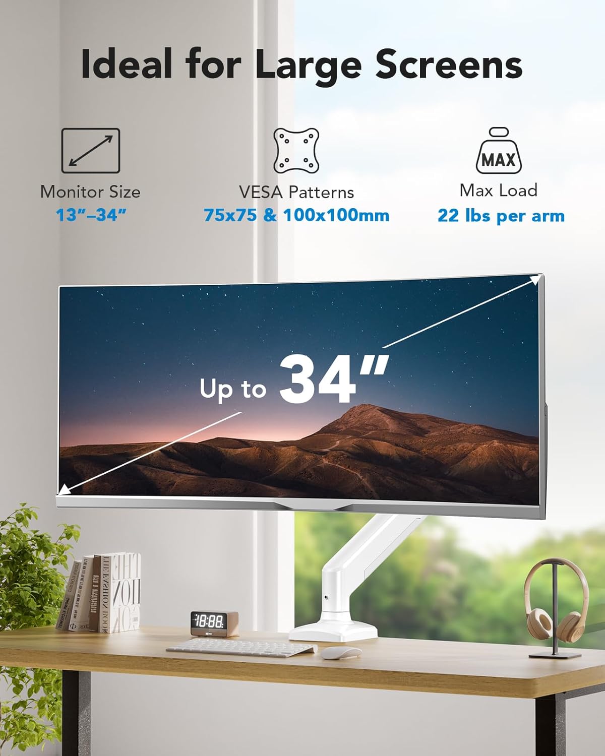 • Fits Large 34″ Screens: The computer single monitor stand is compatible with most 13″–34″ flat or curved screens with VESA mounting patterns 75x75 or 100x100mm. The wide size range allows you to mount most monitors above the desktop to free up valuable desktop space