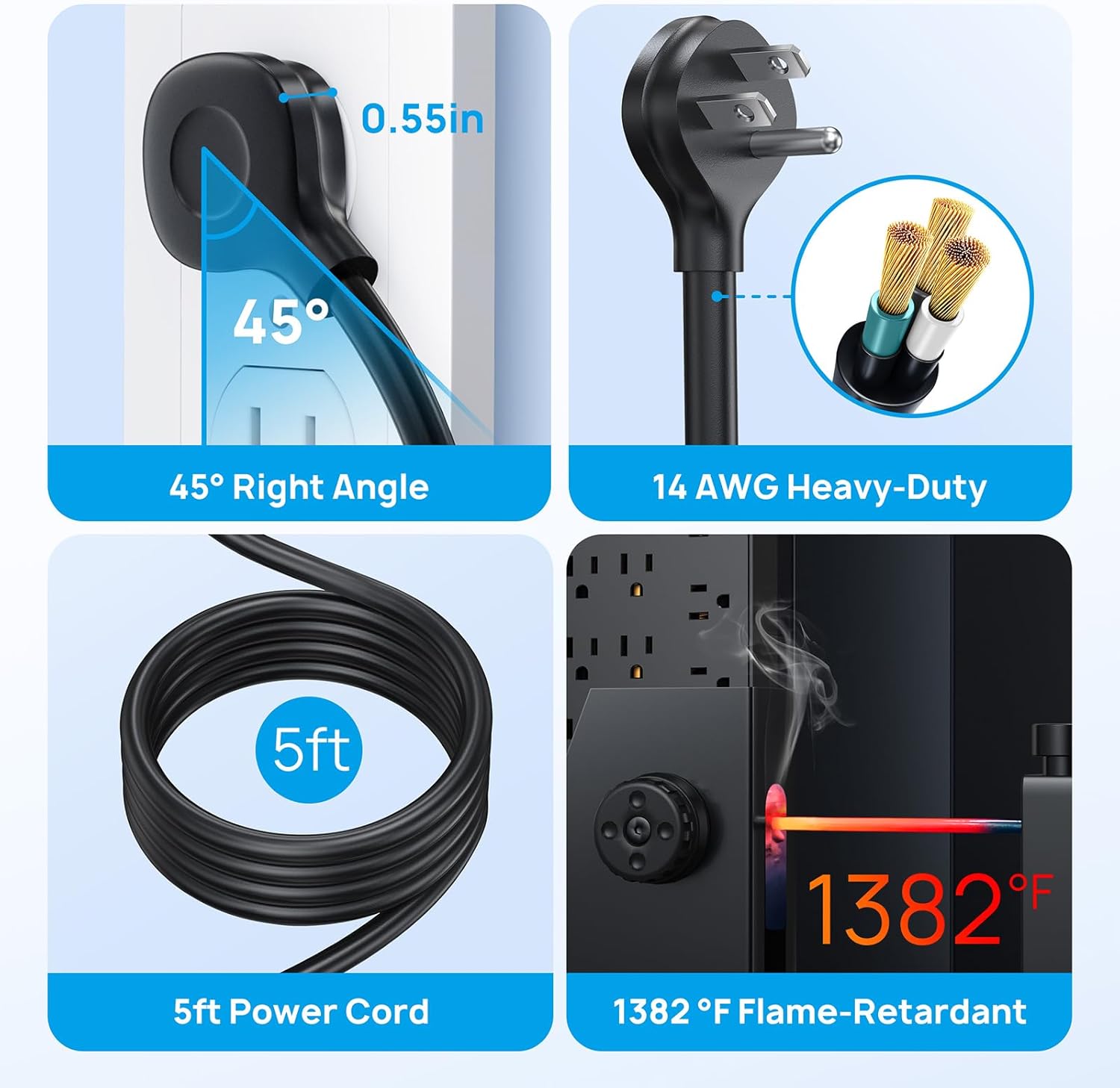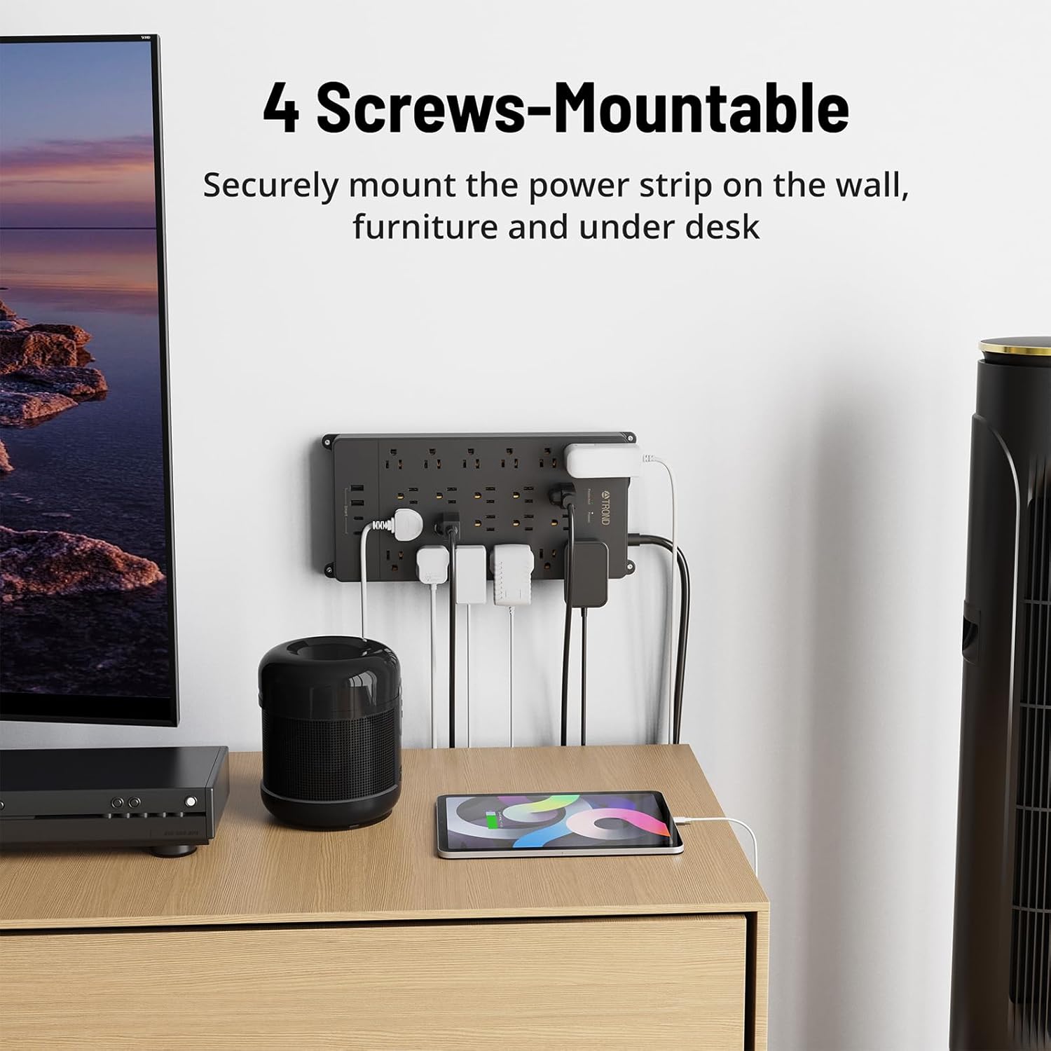 • 【Wall Mount and Flat Plug】Large power strip equipped with 4 screw holes in the corners, allows you to securely mount the surge protector box on the wall or under the desk. The 45° angle flat plug design is perfect for hiding behind furniture, bookshelves, and bedside tables in tight spaces