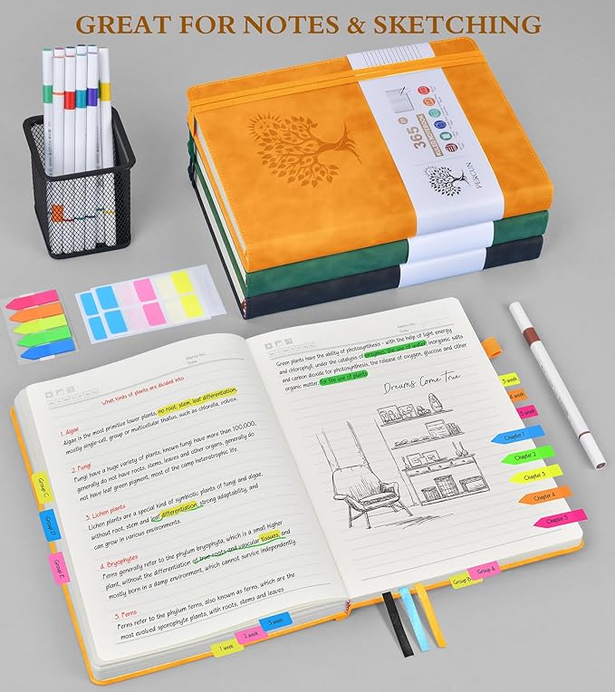 • 【180°Lay Flat for Writing】Our notebook also comes with 180°Lay Flat Journal Notebook, which makes writing a breeze. The elastic pen holder and bookmark ensure that you never lose track of your pen, and the 2 elastic closures ensure that your journal stays securely closed. The 3 colored ribbon bookmarks and 3 sticky labels provide even more ways to customize your journal to your liking.Built-in back pocket that is great for storing loose notes, cards, or other important items.