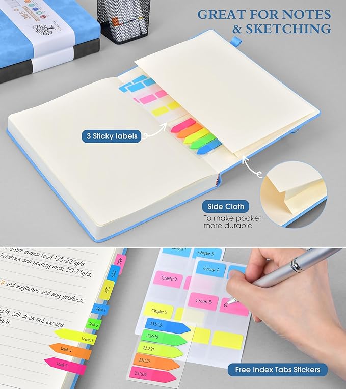• 【180°Lay Flat for Writing】Our notebook also comes with 180°Lay Flat Journal Notebook, which makes writing a breeze. The elastic pen holder and bookmark ensure that you never lose track of your pen, and the 2 elastic closures ensure that your journal stays securely closed. The 3 colored ribbon bookmarks and 3 sticky labels provide even more ways to customize your journal to your liking.Built-in back pocket that is great for storing loose notes, cards, or other important items.