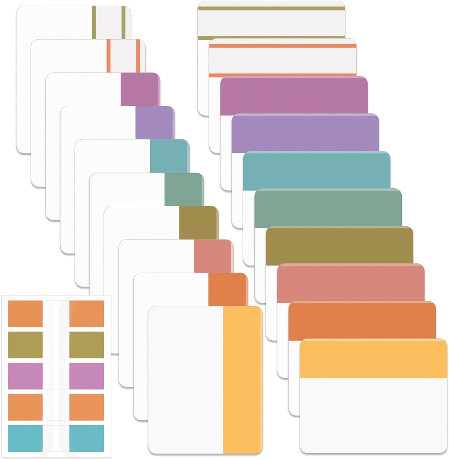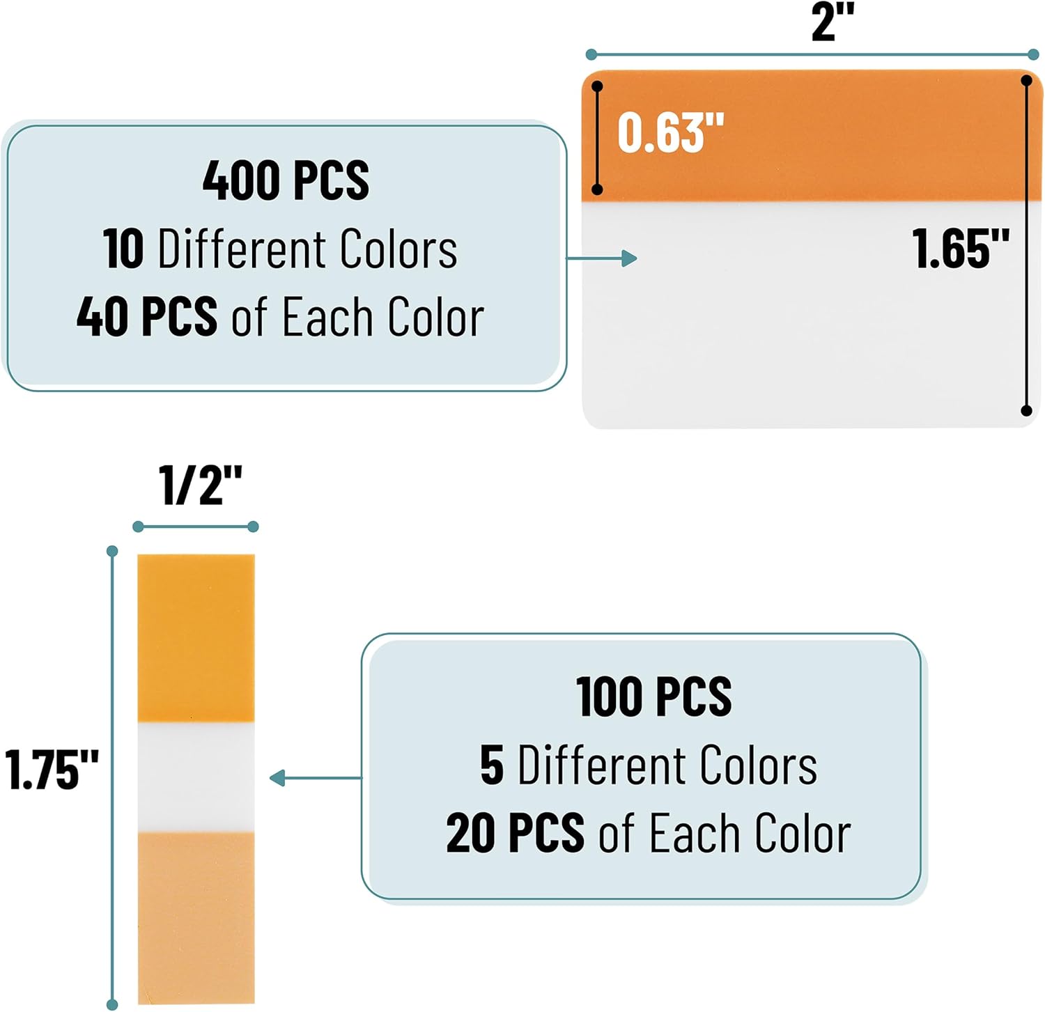 • Package includes 500 pieces of sticky tabs in 21 sets, 400 pieces of 2-inch tabs in 20 sets with 10 different colors, and 100 pieces of 0.5-inch tabs in 1 set with 20 pieces of each color.