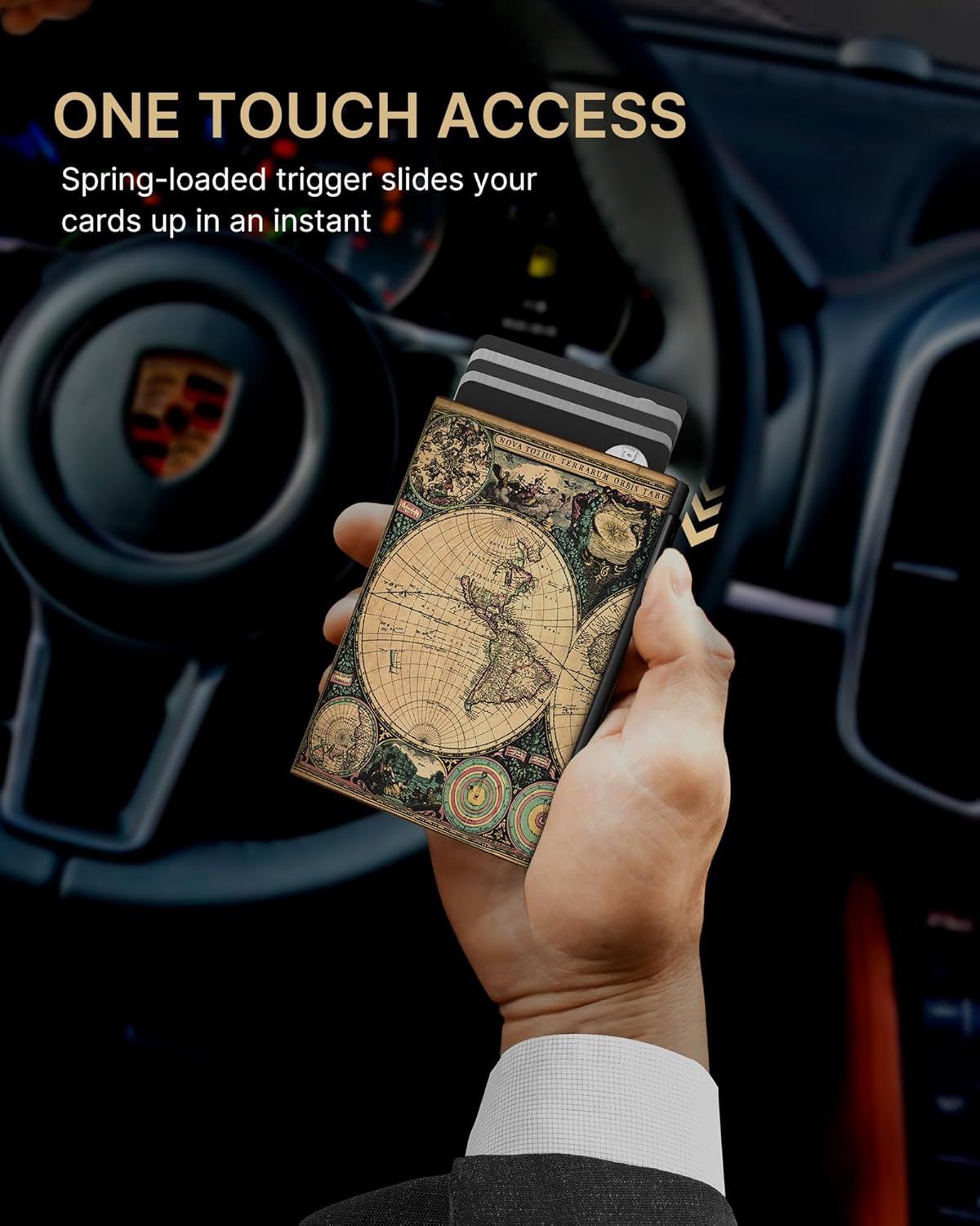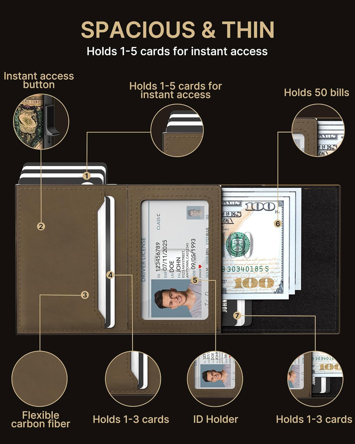 • 【QUICKEST ACCESS】Instant card access at the tap of a button by a single hand. Stores 10-15 cards and 15 bills total. The pop-up aluminum card holder stores 6-7, the built-in cash slot stores 50+ bills, and the ID window for driver's licenses.