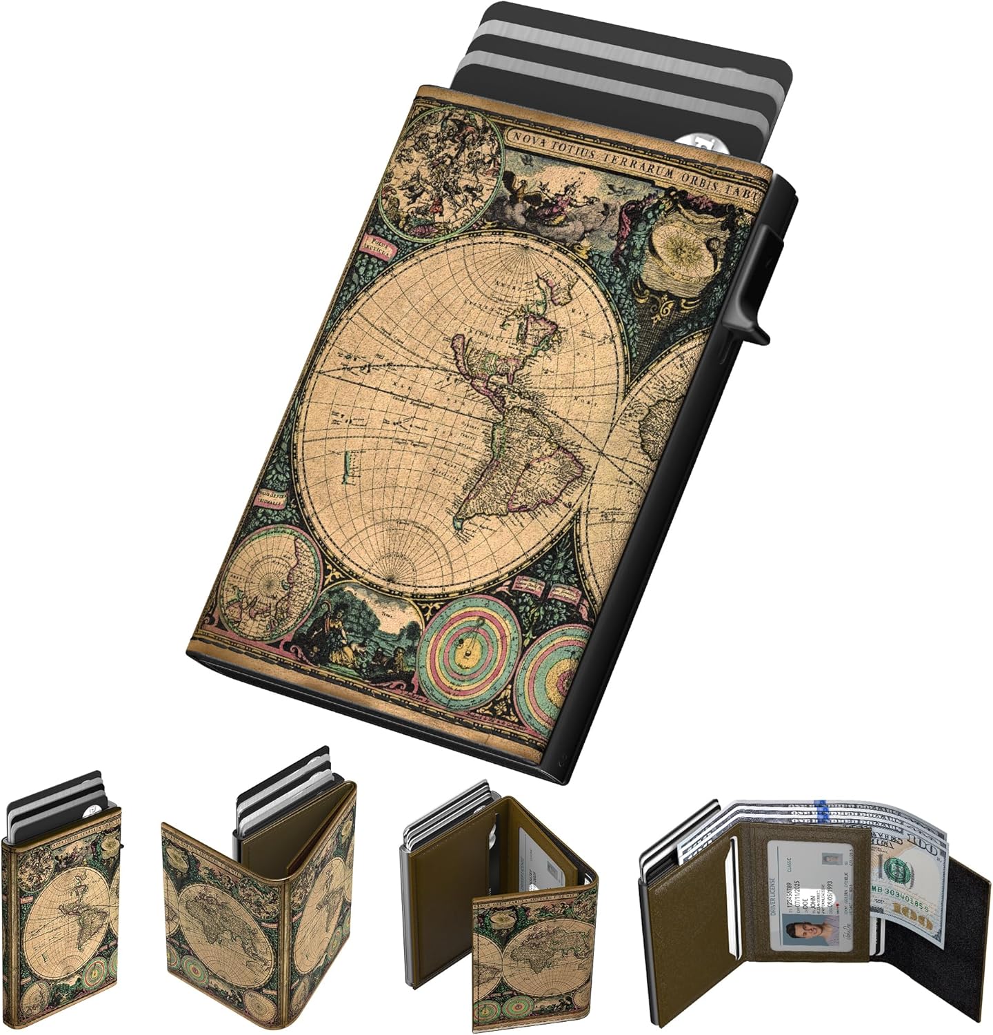 typecase Mens Wallet Card Holder: Pop Up Aluminum Case, Carbon Fiber Leather, Smart, RFID Blocking, Slim, Minimalist, Front Pocket - 9-14 Card Capacity | ID Window | Cash Slot (Map)