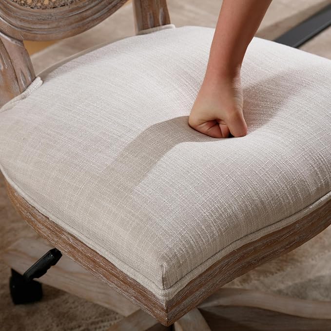 LukeAlon Rattan Back Linen Office Chair, Adjustable Height Swivel Task Chair with Wood Frame Armless Desk Chair with Wheels Upholstered Round Back Vanity Chair for Home Office Study Room, Beige
