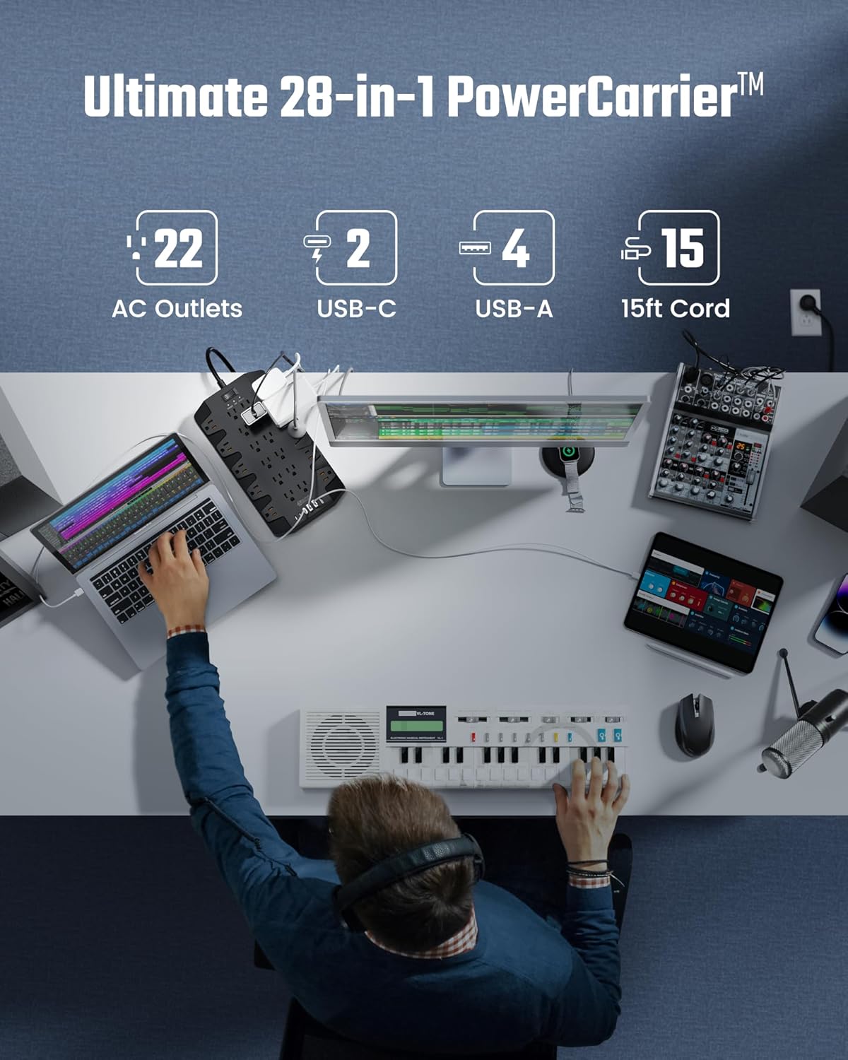 • 【Ultimate 28-in-1 PowerCarrier】With 22 grounded 3-prong outlets and 6 USB ports (2 USB-C + 4 USB-A), SUPERDANNY NEWEST large power strip accommodates all the power devices in one place. Only one charging station is enough for all your gaming setup, media essentials, phone, tablet, PC, laptop, computers, headphones, sound system, TV, router, monitor, camera, smartwatch, microphone, printer, fax machine, scanner, fan, etc. Have a clutter-free gaming corner or home office now.