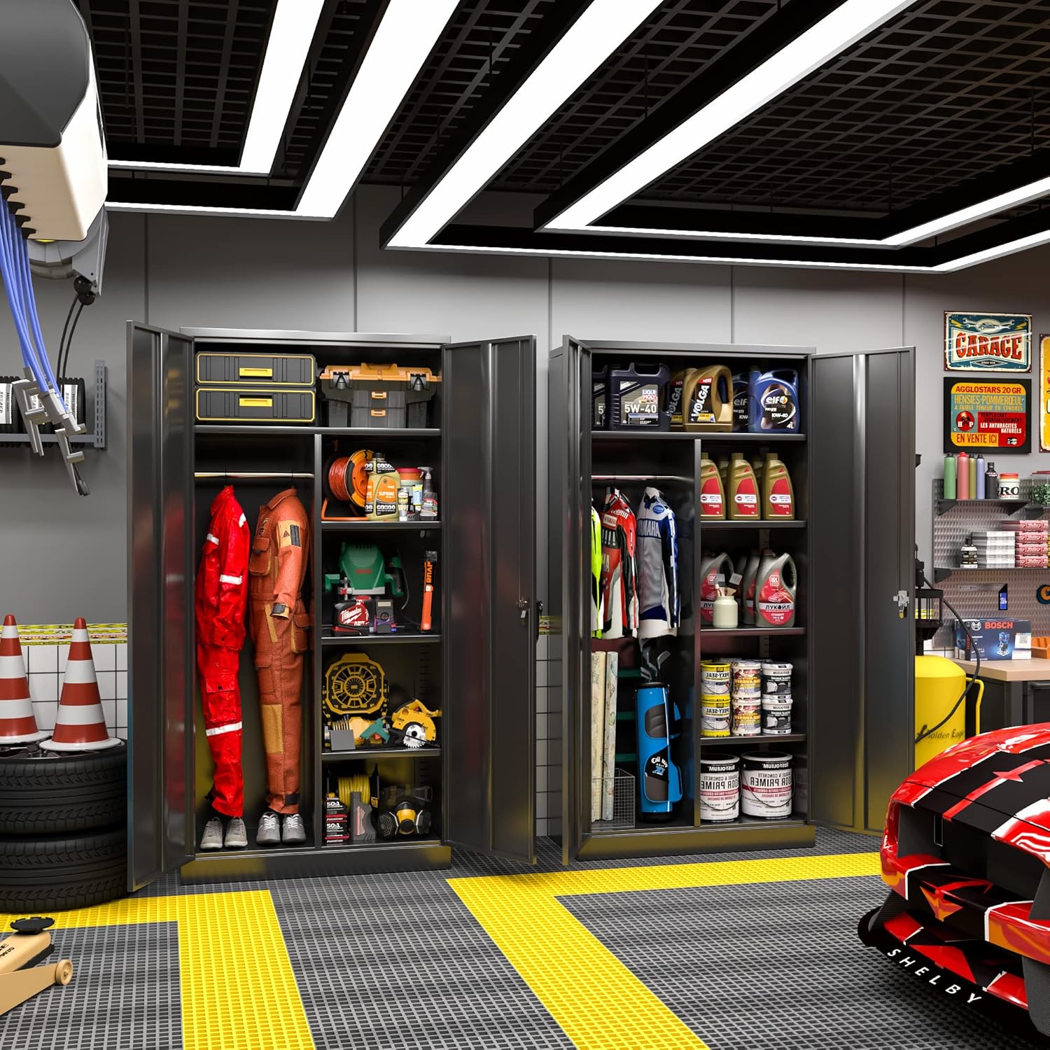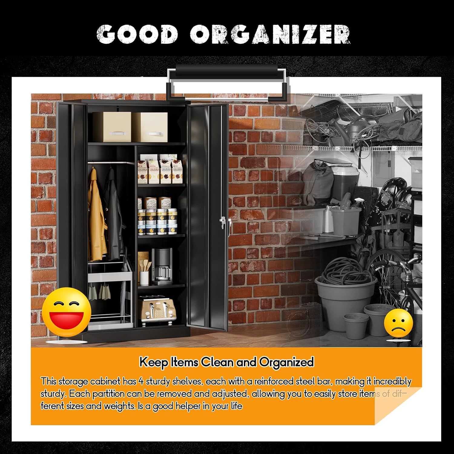 • ★【Extra Large Capacity】: Greenvelly lockable metal garage storage cabinet adopts a large size design of 72 "H x 36" W x18 "D, which can provide sufficient storage space. The tall steel storage cabinet has hanging railings and 3 shelves, which not only have hanging clothes but also storage partitions, making it versatile. Metal lockers with locked doors are great for protecting your property and are suitable for garages, home offices, cleaning rooms, utility rooms, and laundry rooms.