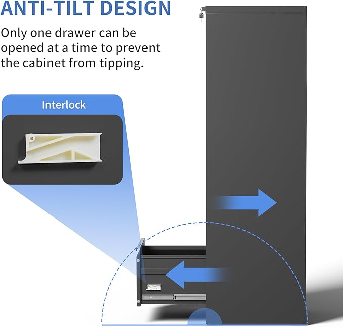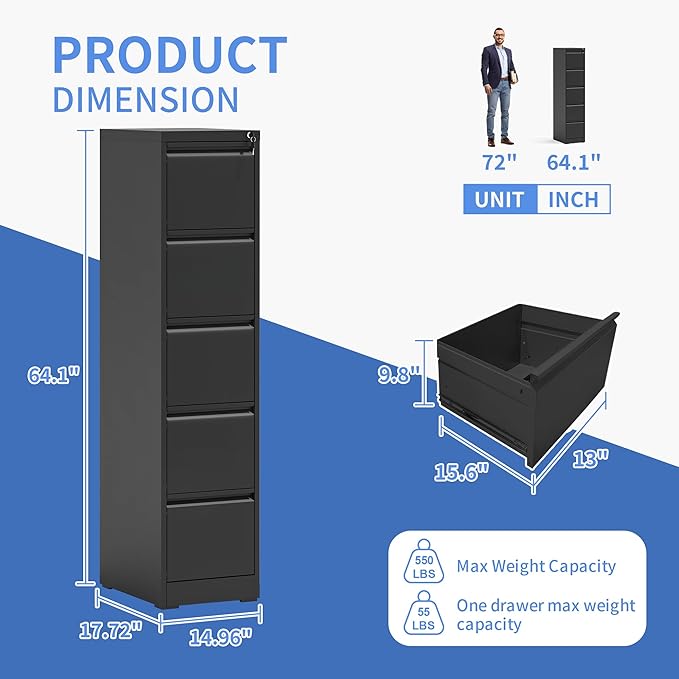• 【Anti-tilt Design】This 5 drawer metal file cabinet designed with full extension and steel ball-bearing suspension, all drawers of the black vertical 5 drawer file cabinet can be opened and closed quietly and easily. The anti-tilt system ensures that only one drawer can be open at a time, preventing the metal file cabinet from tipping over. You can have peace of mind knowing that your important documents and items are safe and secure.