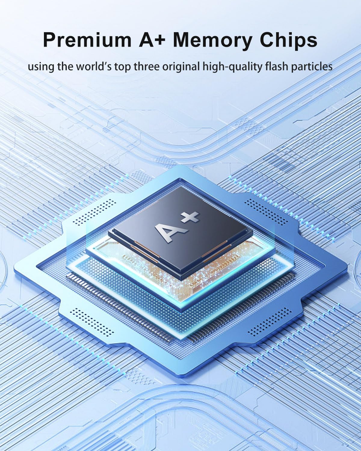 • Versatile use. Backed by top-quality A+ memory chips, the external solid state drive offers sustainable performance for handling high-res photos, 8K video editing, games, graphic designs, content creations, and more.