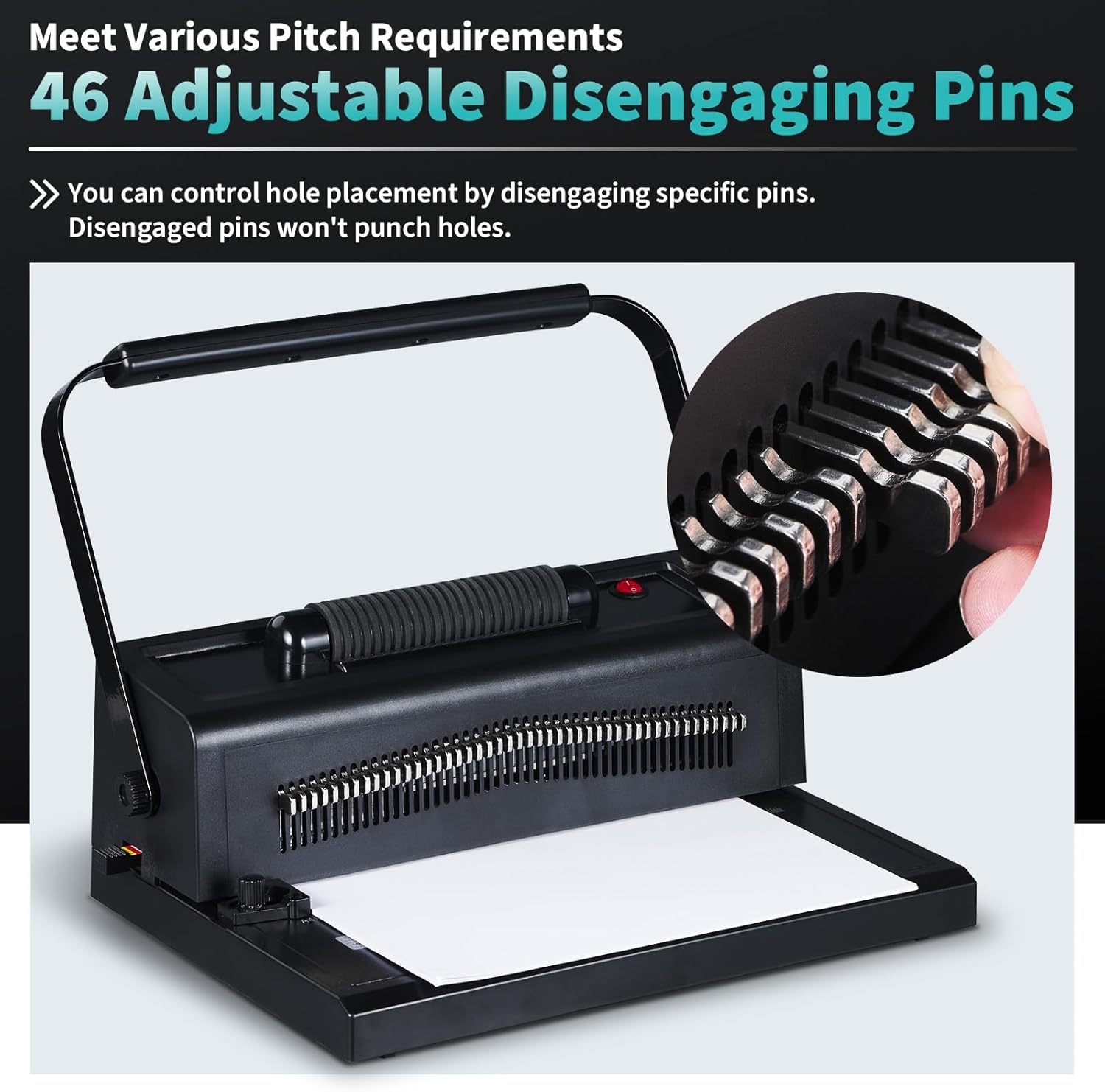 • 【Adapting to Various Pitch Requirements】The coil binding machine with 46 adjustable disengaging pins offers precise hole punching for any paper size and matches different coil pitches. This feature helps avoid unwanted holes and ensures professional results. It simplifies the binding process, providing flexibility and accurac.