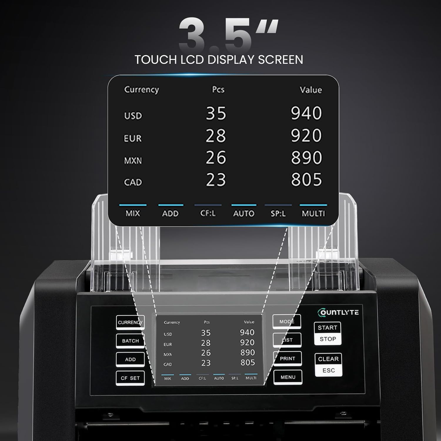 • Easy and convenient to use: The 3.5 inch TFT touch screen and user-friendly menu make cash counting a breeze. Counting speed up to 1200 bills per minute.The machine is easy to carry with its hidden handle, fully opened back cover for easy cleaning, and comes with the option to upload count data to your computer or print details with a printer via serial cable