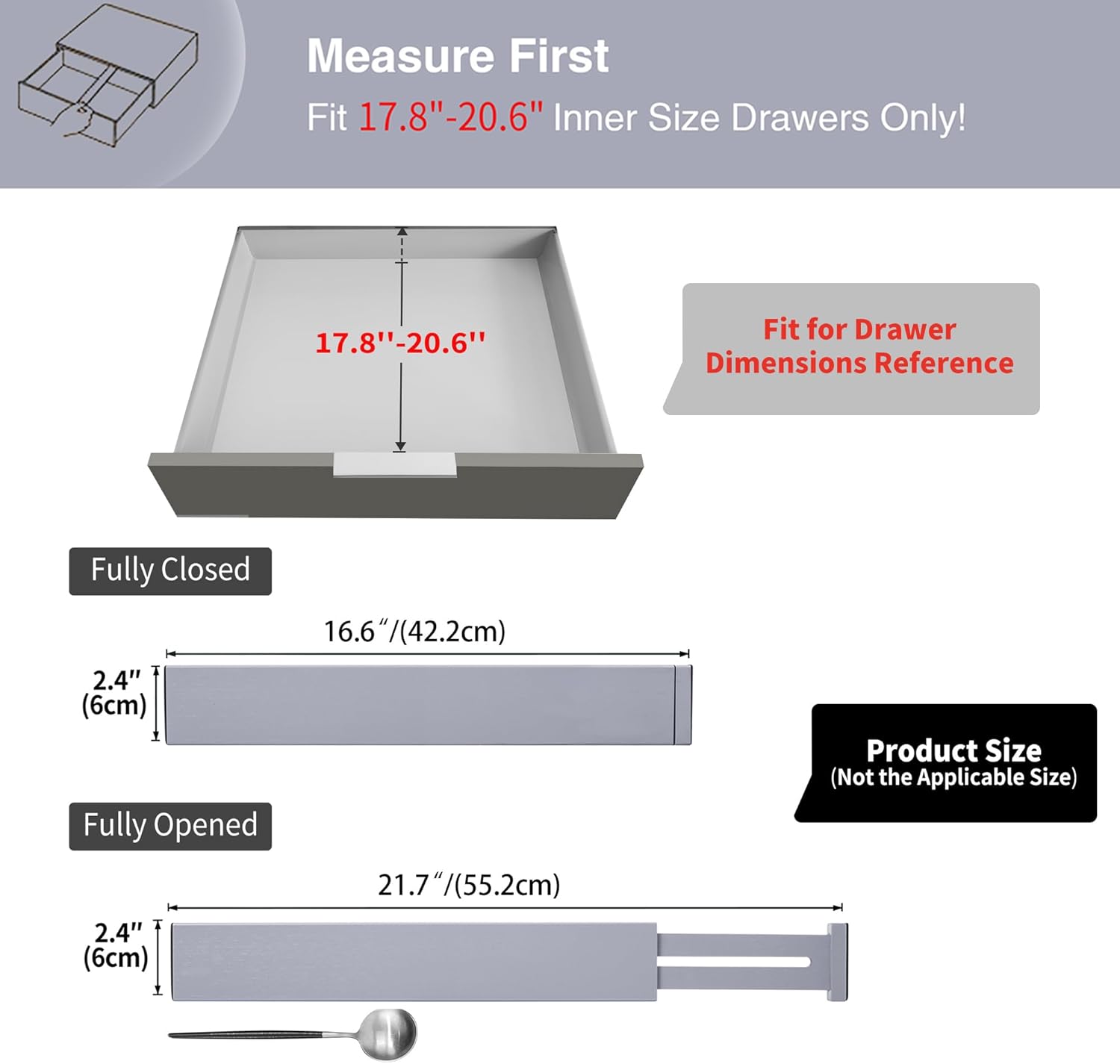 • Recommend Drawer Dimension: **Measure Your Drawers Before Buying!** This product is designed for drawers with an inner size of 17.8" to 20.6". If your drawer's inner size exceeds 20.6", it will doesn't work