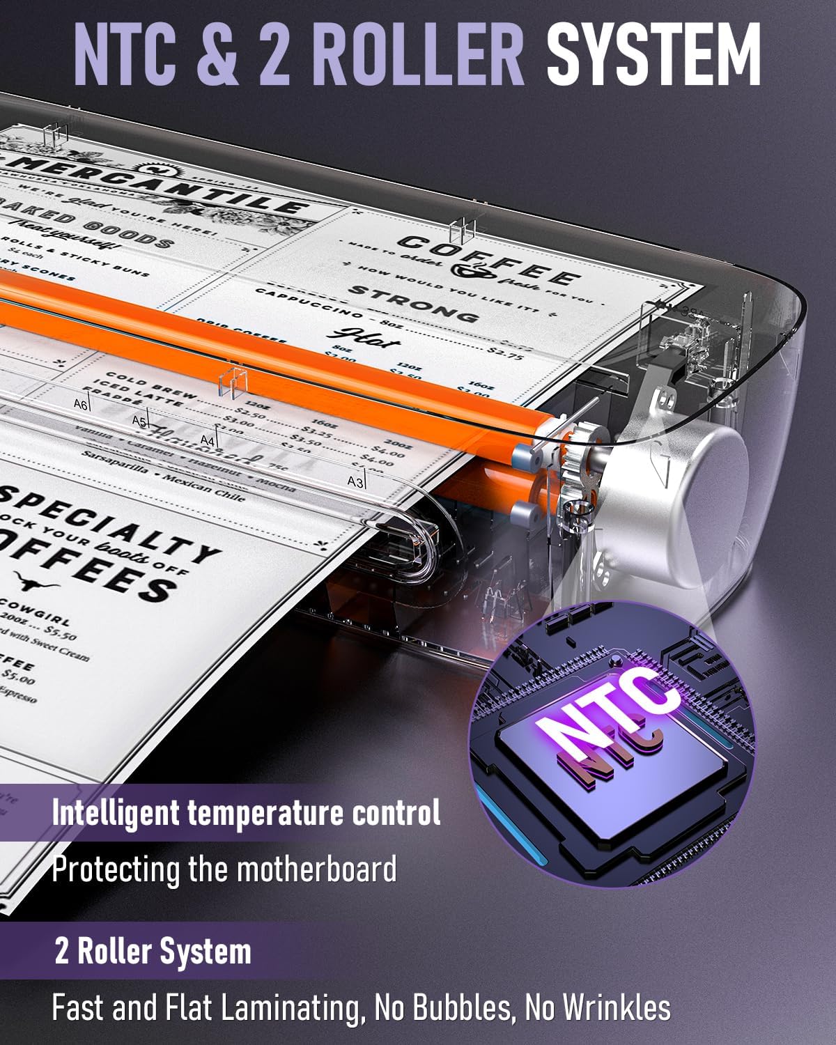 • Dual Roll System & Intelligent Protection: The dual-roll system ensures precise heat and pressure for impeccable lamination, preventing wrinkles, blisters, and curling. Our intelligent temperature control system enhances safety and efficiency, extending the laminator's service life. With an auto shut-off function, you'll stay safe and conserve energy whether you're at school, the office, or home