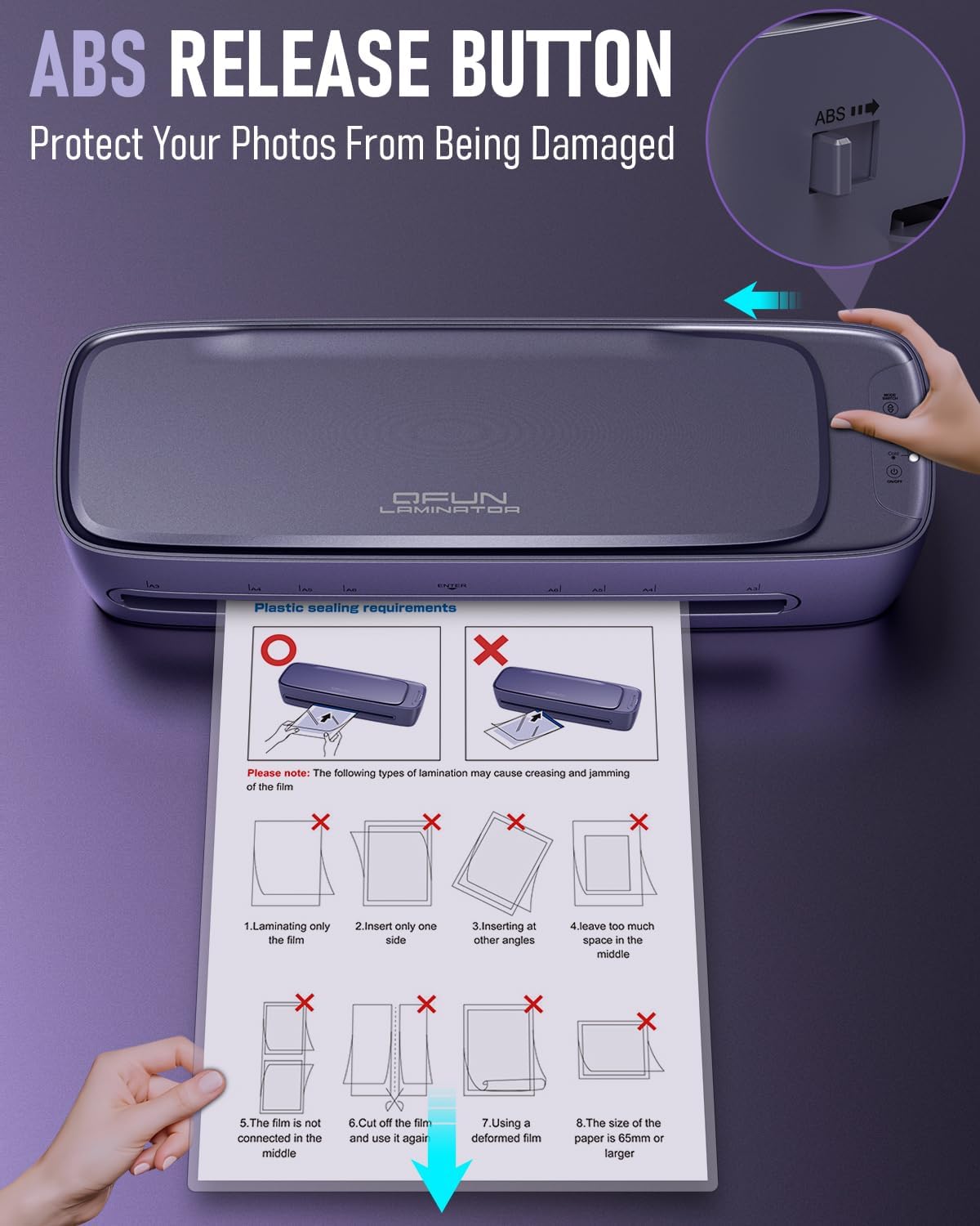 • Easy Operation Without Jams: The laminate machine with laminated paper excels in simplicity with no complex setups. The intuitive control panel and user-friendly interface make operation a breeze. Thanks to the short warm-up time and fast lamination speeds, you can achieve professional results without hassle. Say goodbye to paper jams, just press the ABS button to clear them and safeguard your important documents