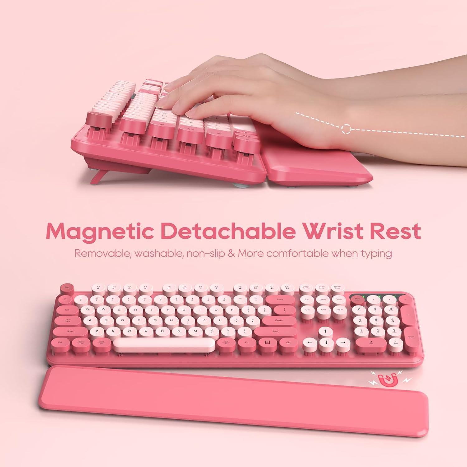• Special Feature : Magnetic Detachable Hard Wrist Rest & Waterproof, Splash-proof Design, Removable Floated Round Keycaps & Foldable Tilt Legs, Wireless Typewriter Keyboard & Auto Sleep Mode Magnetic Detachable Hard Wrist Rest & Waterproof, Splash-proof Design, Removable Floated Round Keycaps & Foldable Tilt Legs, Wireless Typewriter Keyboard &… See more