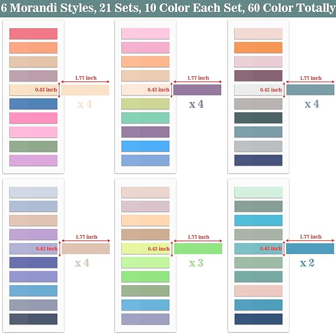• Plentiful quantity: package include 21 sets of 0.43 x 1.77 inch morandi sticky tabs for annotating books, 4200 pieces in total, abundant quantity and colorful page flag tabs, enough to use for a long times, convenient to mark annotate, and highlight important information