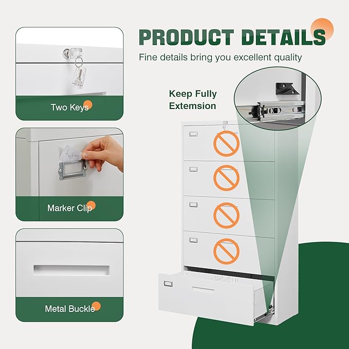 • 〖Durable Metal Material〗5 Drawer file cabinet is made of 0.8mm thick steel,whole is solid and does not deform, and it is stronger than wooden filing cabinets in terms of firmness, durability, moisture resistance, and fire protection.
