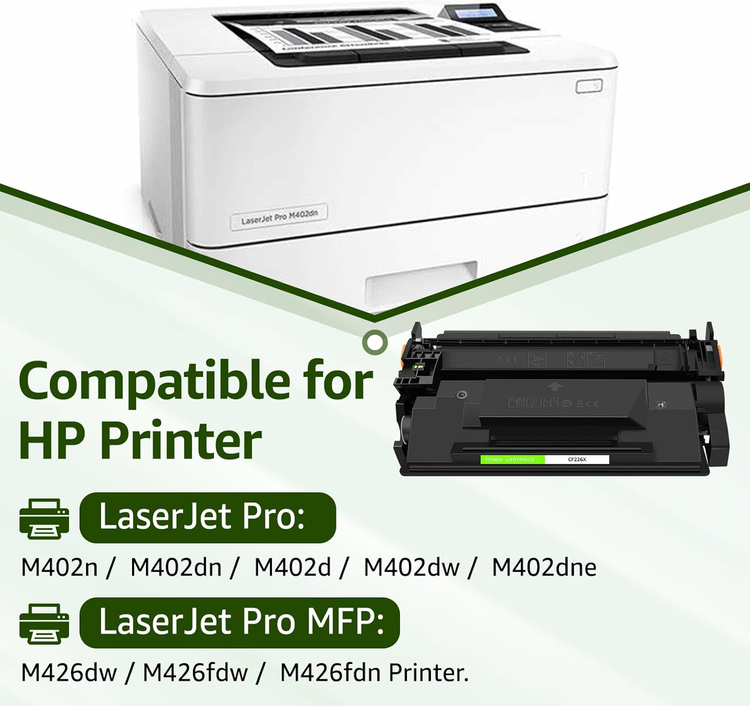 • Compatible for HP Printer: LaserJet Pro M402n / LaserJet Pro M402dn / LaserJet Pro M402d / LaserJet Pro M402dw / LaserJet Pro M402dne / LaserJet Pro MFP M426dw / LaserJet Pro MFP M426fdw / LaserJet Pro MFP M426fdn Printer.