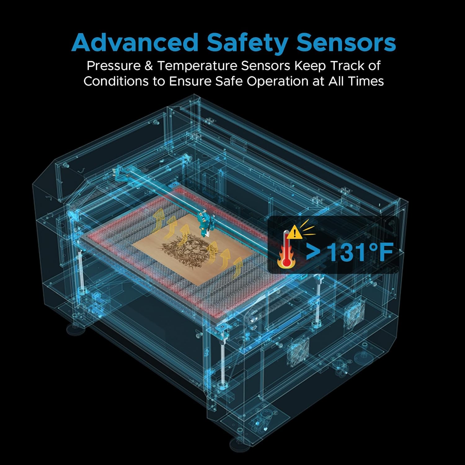 • Enhanced Safety: Our built-in sensors continuously monitor temperature and air pressure, stopping the machine when necessary, while the powerful air pump and 318 cfm turbo exhaust fan maintain a clean workspace by minimizing dust and debris