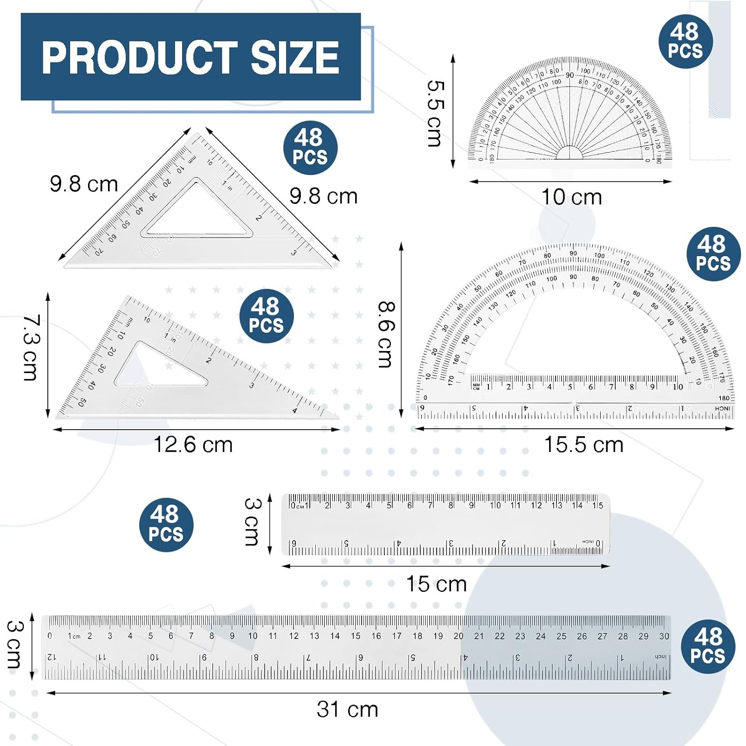 • Complete math tool set: You will get 48 6-inch protractors, 48 4-inch protractors, 48 45-degree triangles, 48 60-degree triangles, 48 6-inch rulers and 48 12-inch rulers, a total of 288 pieces; the complete combination meets the needs of various occasions, you can choose the appropriate ruler to work according to your needs